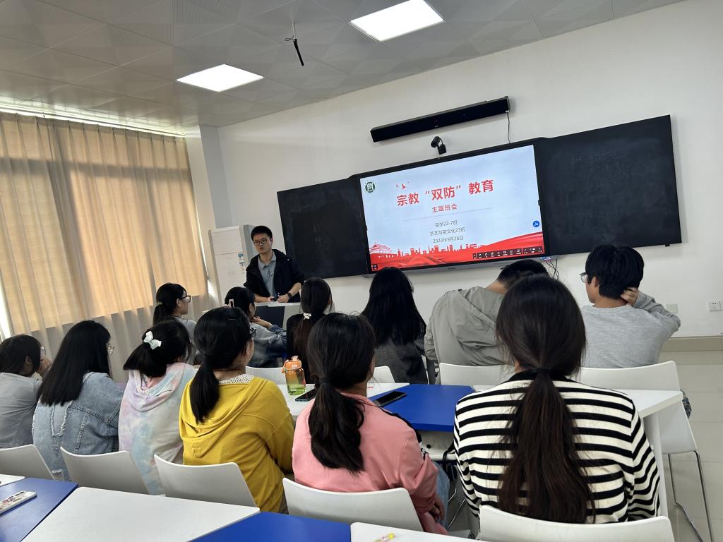 辅导员们通过主题班会向同学们普及了“宗教双防”工作,结合河南省大学生宗教政策法规明白卡、《高校民族宗教工作知识读本》引导学生树立正确的宗教观,认真辨别宗教与科学的区别,认清邪教和封建迷信的本质,从而更加坚定理想信念,增强大学生担当民族复兴重任的责任感和使命感。