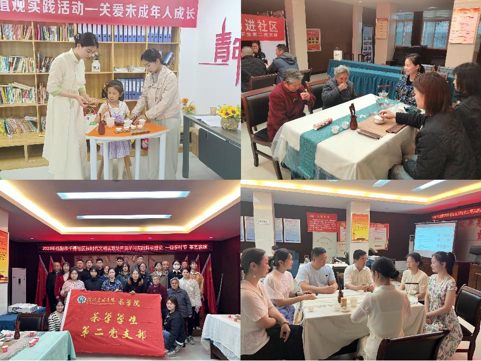 茶学院一直以来十分重视在基层开展茶文化的传播和茶知识的普及活动,学院师生以传承弘扬中国茶文化为己任。近年来,学院的青年学子在梁玉洁老师的带领下,前往千禧社区开展了多人次的茶文化进社区活动。此外,学院以开放的姿态,面向信阳青少年开展了十余场茶文化体验活动,以传承中国茶文化的初心,努力写好“三茶统筹”的大文章。