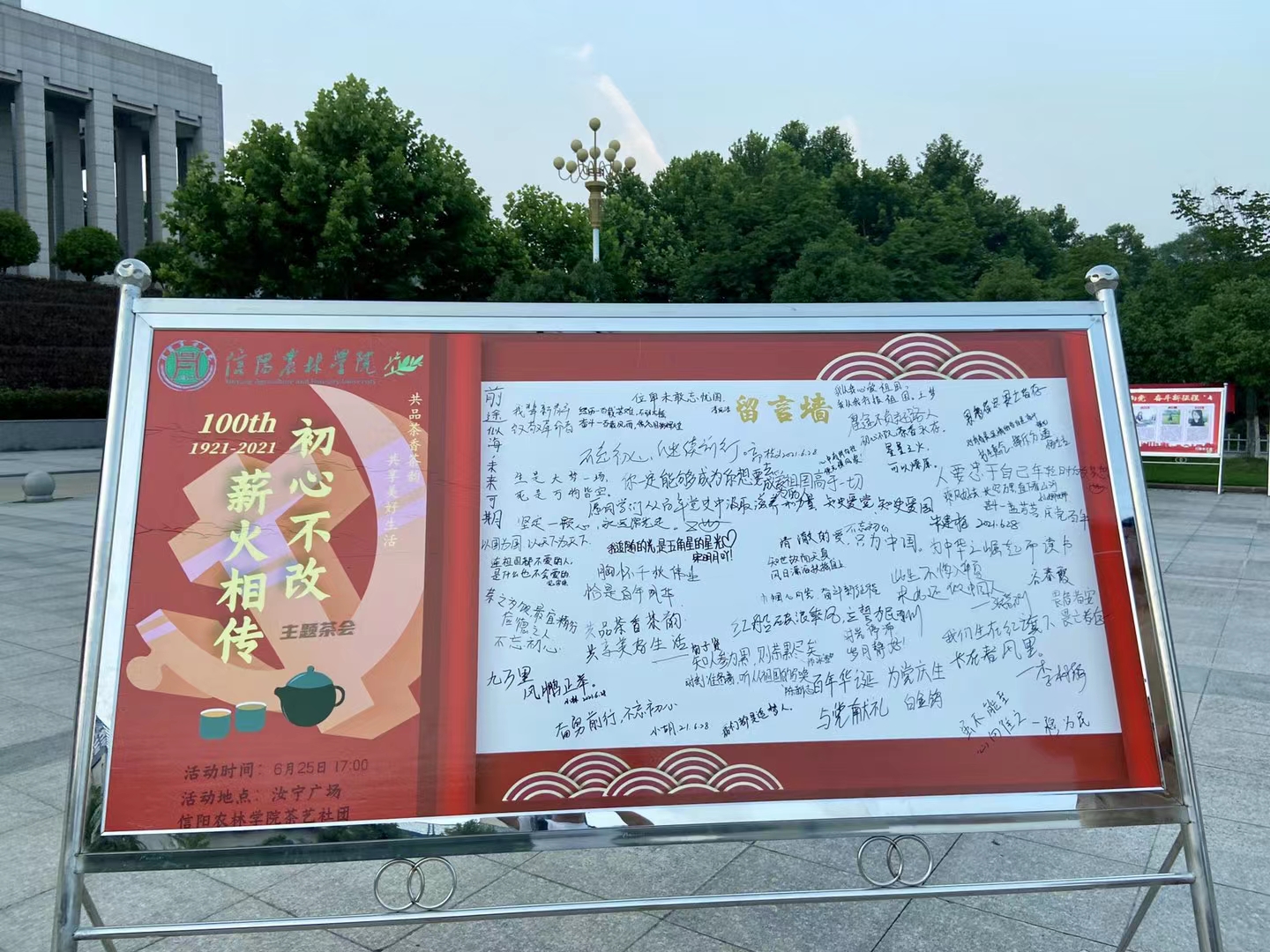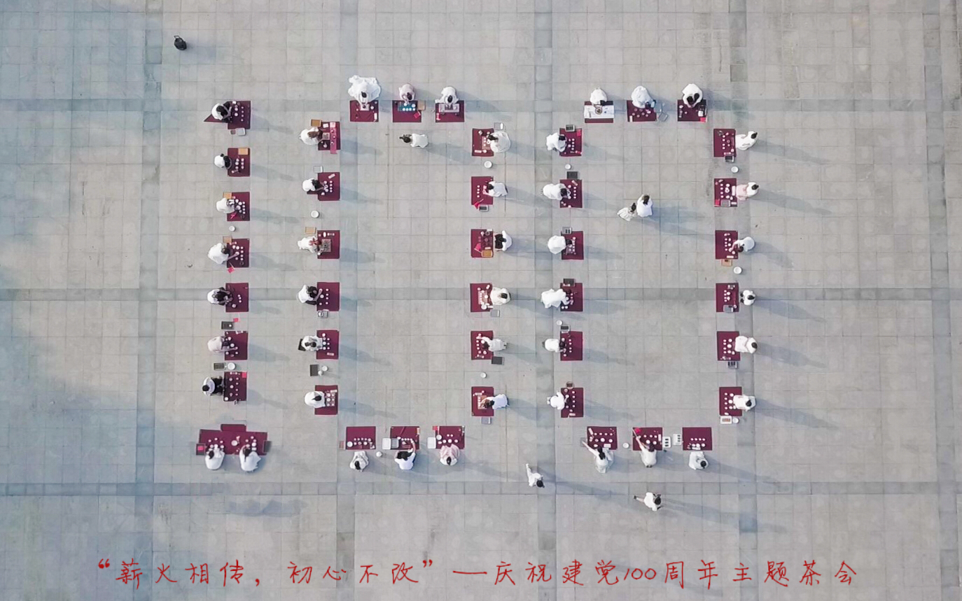 2021年是中国共产党百年华诞,百年征程波澜壮阔,百年初心历久弥坚。在建党节来临之际,6月28日下午,茶学院茶文化与营销教研室与茶艺社团承办的“薪火相传,初心不改”---庆祝中国共产党成立100周年主题茶会在校汝宁广场前草坪上举行。茶学院50多名同学参加了此次茶会。校长邢勇、校团委书记王鹏,茶学院院长郭桂义、茶学院党总支副书记朱建梅、茶学院办公室主任池水婧观摩本次茶会,并与同学们进行了交流。专任教师王杉参与其中,与同学们一起泡茶。