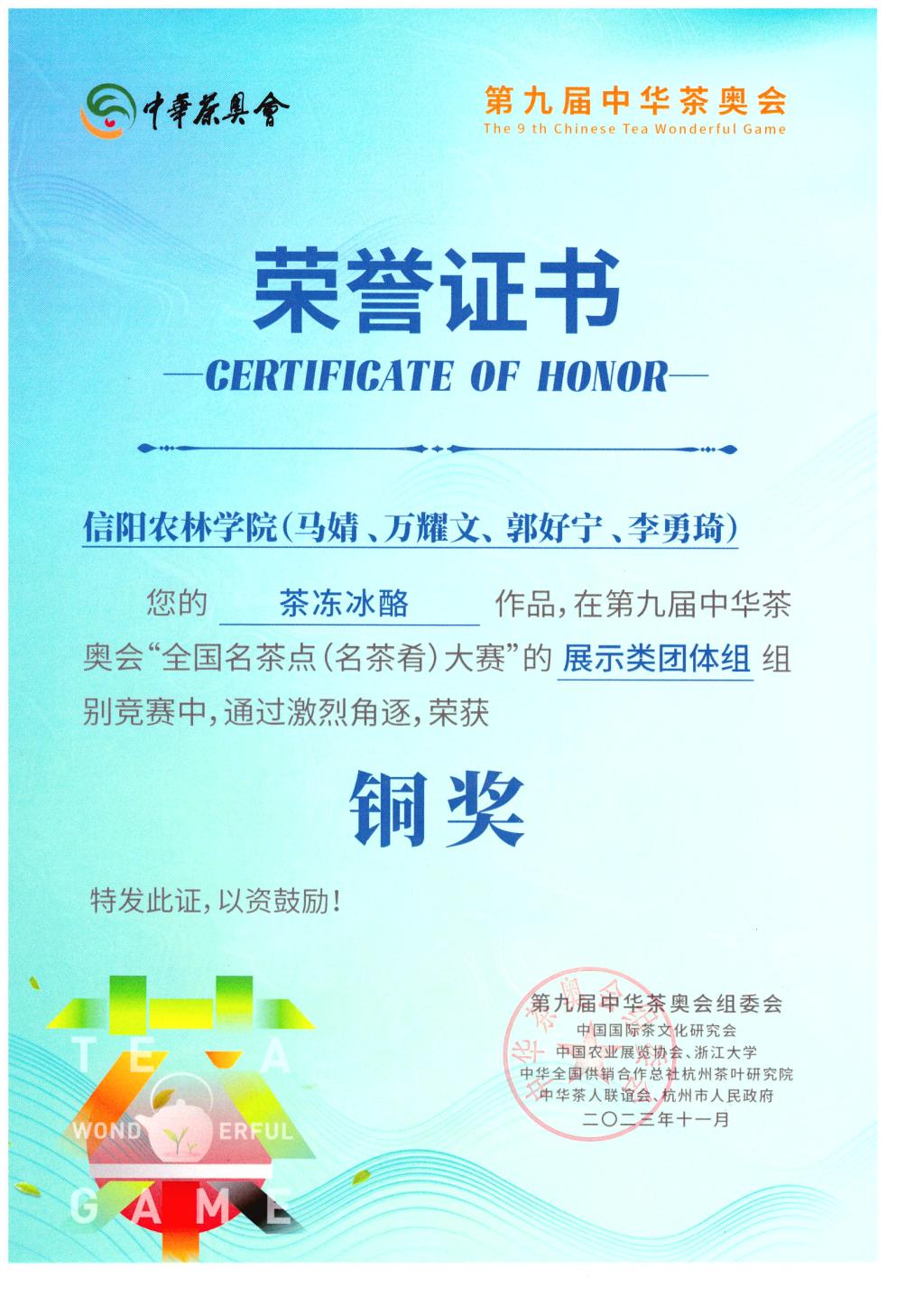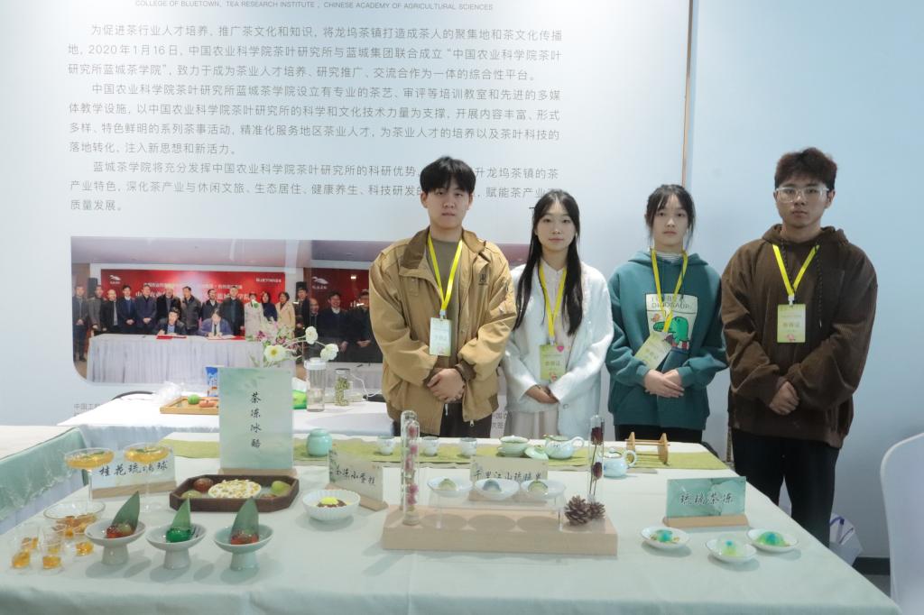 我院教师朱尧带领“食小茶”创新创业团队学生参与了本次茶奥会的“全国名茶点(名茶肴)大赛”与“新式茶调饮赛”。在朱尧老师的悉心指导和参赛学生的努力拼搏下,斩获国赛铜奖1项、省级银奖1项以及优胜奖1项,其中马婧等同学的茶冻冰酪作品获全国名茶点(名茶肴)大赛展示类团体组铜奖、栗广涛等同学的琉璃茶冻作品获浙江省第四届茶点名肴比赛展示类个人组别银奖以及李勇琦等同学的岁月静好作品获新式茶调饮赛“茶+特调”组优胜奖。期间,朱尧老师接受了浙江电视台经济生活频道的采访。