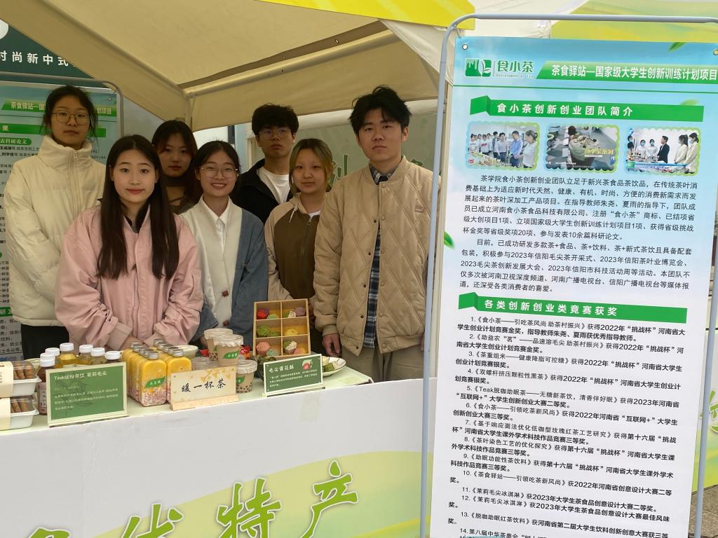 我院国家级创新创业团队“食小茶”在指导教师朱尧的带领下已立项2023年国家级大学生创新训练计划项目1项、2022年河南省大学生创新训练计划项目1项(已结项)、获得省级竞赛奖项20余项(其中省级挑战杯金奖2项、二等奖5项)等。此外,师生在国内刊物发表多篇论文,获得“一种茶叶双螺杆挤压造粒用旋切装置”等多项专利,研发出以下二十余款新型茶食品和饮料。(撰稿:朱尧 摄影:浮天航)