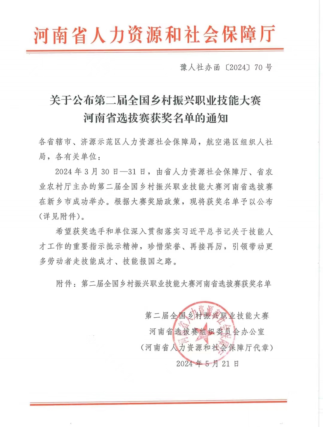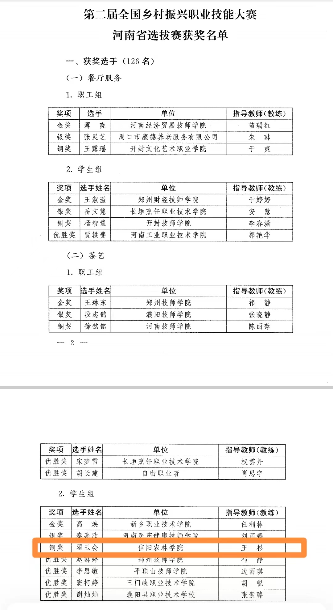 2024年3月30日–31日,由省人力资源社会保障厅、省农业农村厅主办的第二届全国乡村振兴职业技能大赛河南省选拔赛在新乡市举办。根据有关奖励政策,经审核决定,省人社厅5月21日发文,向翟玉会等126名在2024年度乡村振兴职业技能大赛中取得优异成绩的选手授予“河南省技术能手”荣誉,并颁发荣誉证书和奖章。同时,在本次比赛中,我学院王杉老师被评为优秀指导教师,她凭借踏实的工作作风和富有创造性的思维,着眼学生工作的最前沿,走在“学高为师,身正为范”的第一线。