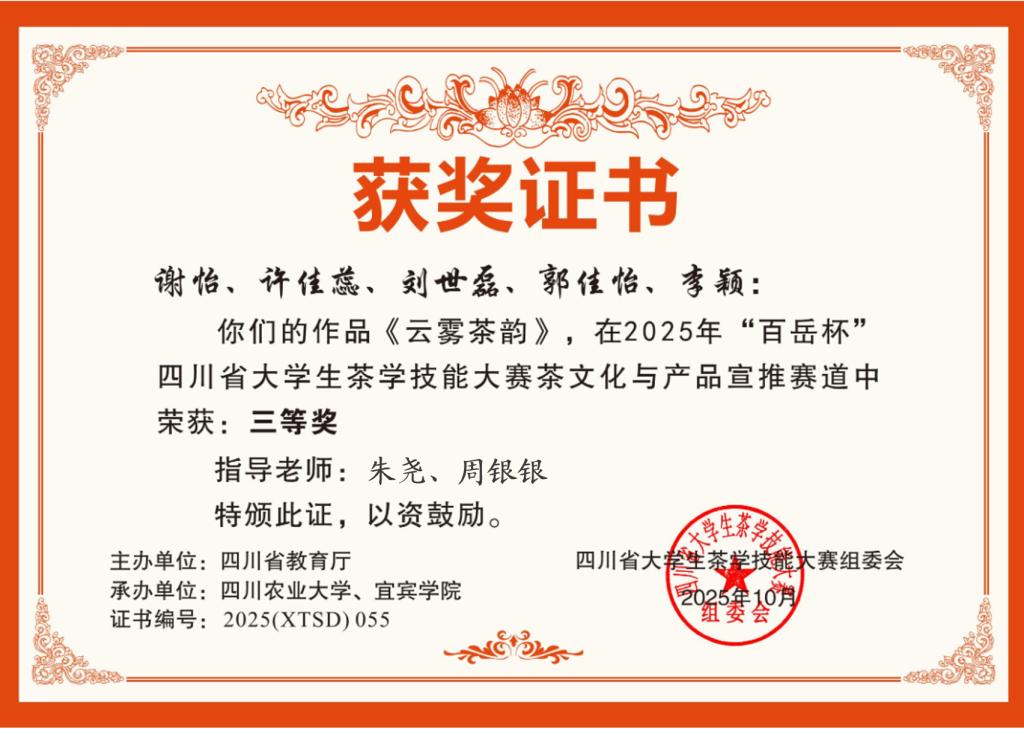 1025日,由四川省教育厅主办,四川农业大学与宜宾学院联合承办的2025百岳杯四川省大学生茶学技能大赛在四川农业大学成都校区圆满落下帷幕。本届大赛吸引了来自四川、河南、贵州、云南等省市26所高校的1200余名师生踊跃参赛。参赛选手覆盖专科、本科及研究生多个培养层次。在这样的高规格、高水平的竞技平台上,竞争异常激烈。我院教师朱尧、周银银指导的《云雾茶韵》》团队荣获茶文化与产品宣推赛道三等奖。(撰稿:朱尧 摄影:会务组)