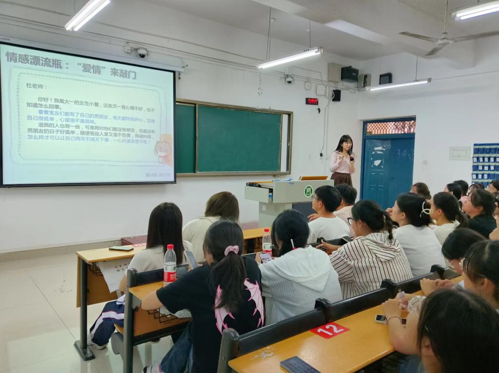 杜老师围绕大一新生面对环境适应、学习问题、人际关系和两性情感的变化等方面的挑战及心理困扰展开阐述,并着重介绍了学生在面对上述不适应情况可以采取的积极应对方式,引导新生学会从多角度思考问题,培养全面的视角和解决问题的能力,主动适应新环境,不断探索和尝试,以实现个人成长和自我提升。