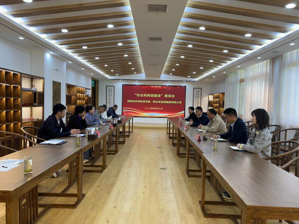 4月9日上午,胖东来商贸有限公司一行应茶学院邀请来校进行校企双方“访企拓岗促就业”座谈会。茶学院党总支书记王鹏、党总支副书记王子浩、副院长尹鹏、就业专员丁岚以及毕业生辅导员梁玉洁、朱尧参会。