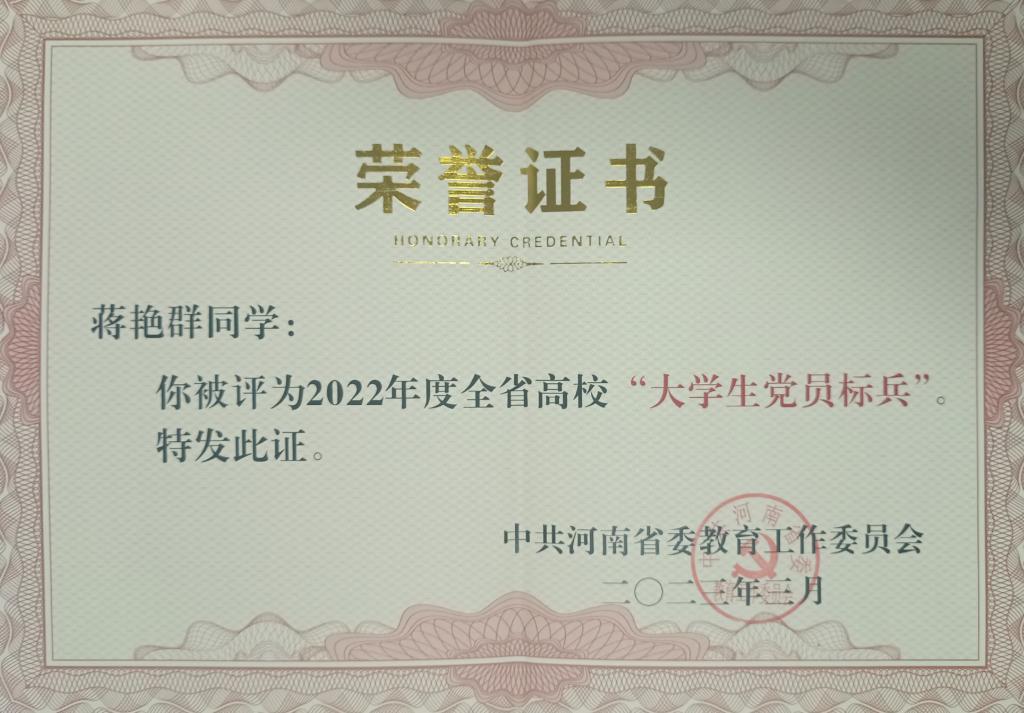 蒋艳群刚入学就向党组织提交了入党申请书,始终把“坚定不移听党话、跟党走,努力成长为堪当民族复兴重任的时代新人”作为自己的人生目标。她积极投身于志愿服务,在信阳市创建全国文明城市和学校创建全国文明校园工作中,带头参与文明交通引导志愿活动,在寒冷的冬天一站就是2个小时,累计志愿时长50多小时。在疫情爆发之际,她积极投身志愿服务,在杭州市西湖区为接种新冠疫苗者建档、引导接种人员留察,一天在岗服务9小时,并多次开展主题班会号召班级同学积极参加志愿服务,在她的带动下班级共有20余人投身到志愿服务中,多人获得所在社区“优秀抗疫志愿者”荣誉称号。