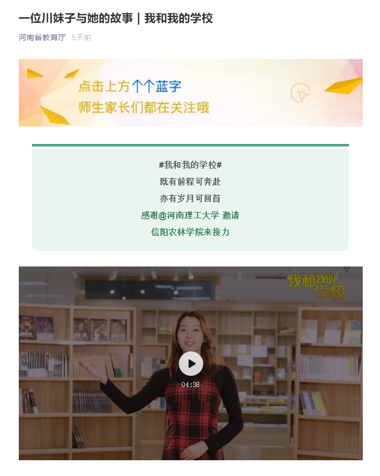 河南省教育厅:一位川妹子与她的故事 | 我和我的学校。点击链接查看详情。