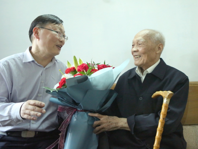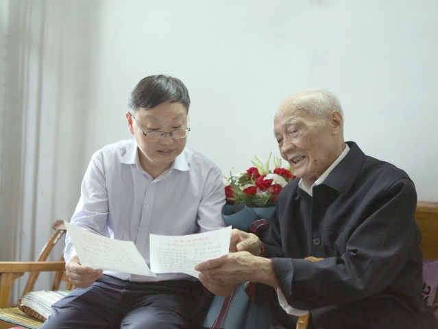 郭桂义教授首先代表中国茶叶学会向黄老赠送鲜花和中国茶叶学会贺卡,感谢黄老为茶叶科技进步、推动茶产业发展所做的贡献,特别是为信阳毛尖的发展所做的贡献,并祝黄老身体安康、年逾茶寿(108岁)。黄老感谢中国茶叶学会,“祝愿茶界同仁事业蒸蒸日上,不忘初心,牢记使命,共圆中国梦”,并特别赋诗一首《祝愿信阳毛尖永辉煌》。郭桂义教授对黄老的生活起居、身体状况等进行了亲切的关怀,并简要介绍了茶学院近3年的发展情况,黄老对beat365在线平台官网培育和向社会输送的茶叶科技人才给予极高的评价,并表示有机会一定要到beat365在线平台官网参观。(张洁 梁玉洁)