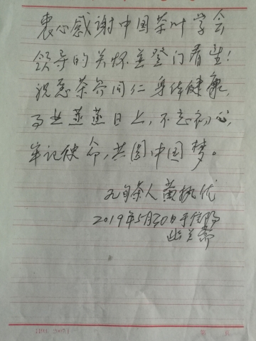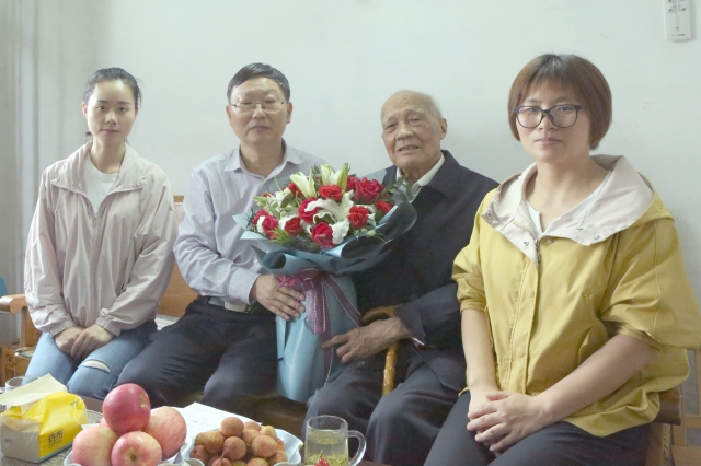 在第三个全国科技工作者日,5月30日下午,受中国茶叶学会委托,中国茶叶学会常务理事、茶学院院长郭桂义教授一行看望慰问平桥区农业局农业技术推广站原副站长、年逾九旬的茶学专家黄执优高级农艺师,代表中国茶叶学会向老一辈茶叶科技工作者致以节日的祝福和衷心的问候。茶学院科研秘书张洁、青年教师梁玉洁和几位信阳毛尖从业者随行拜望。