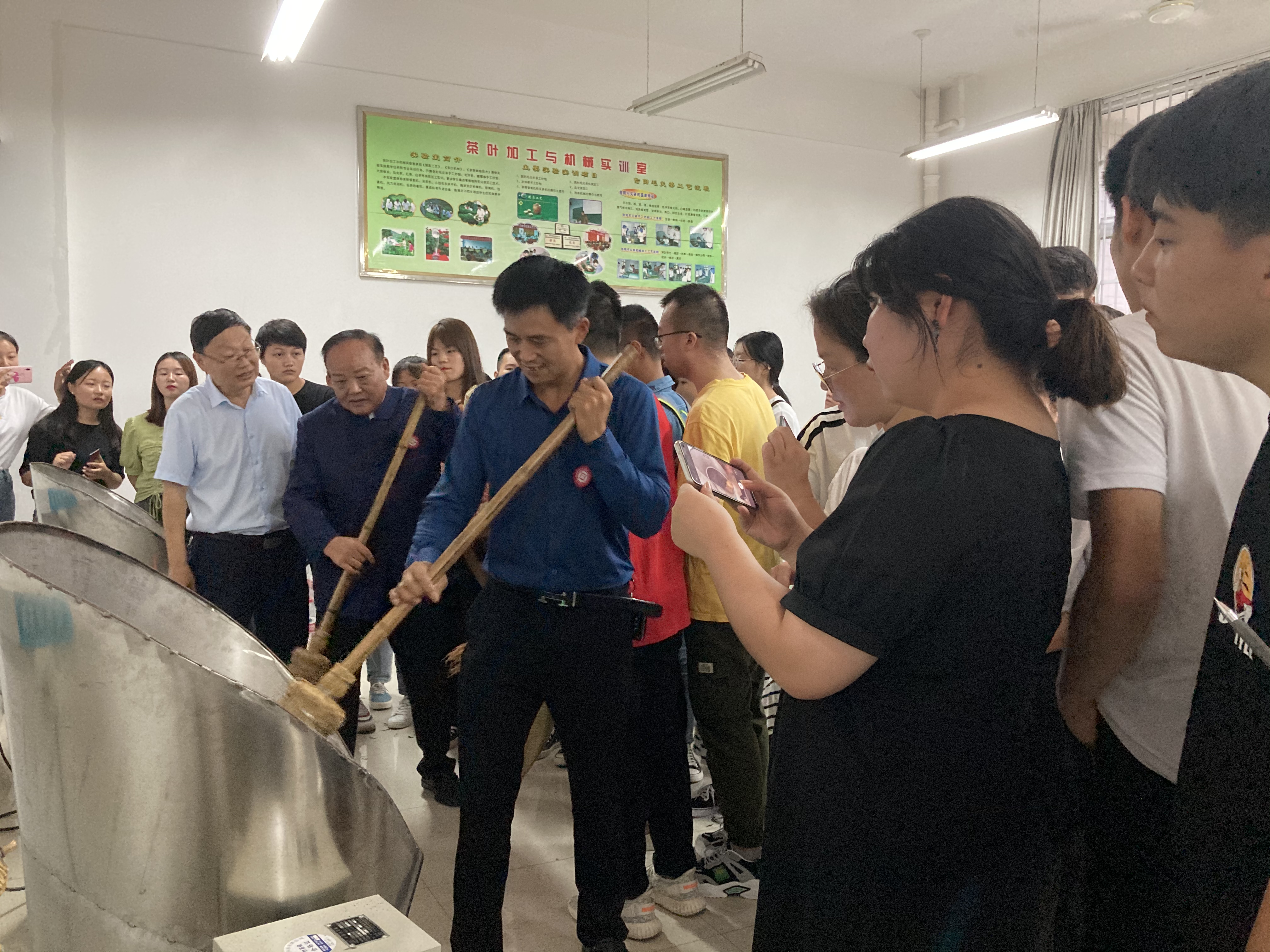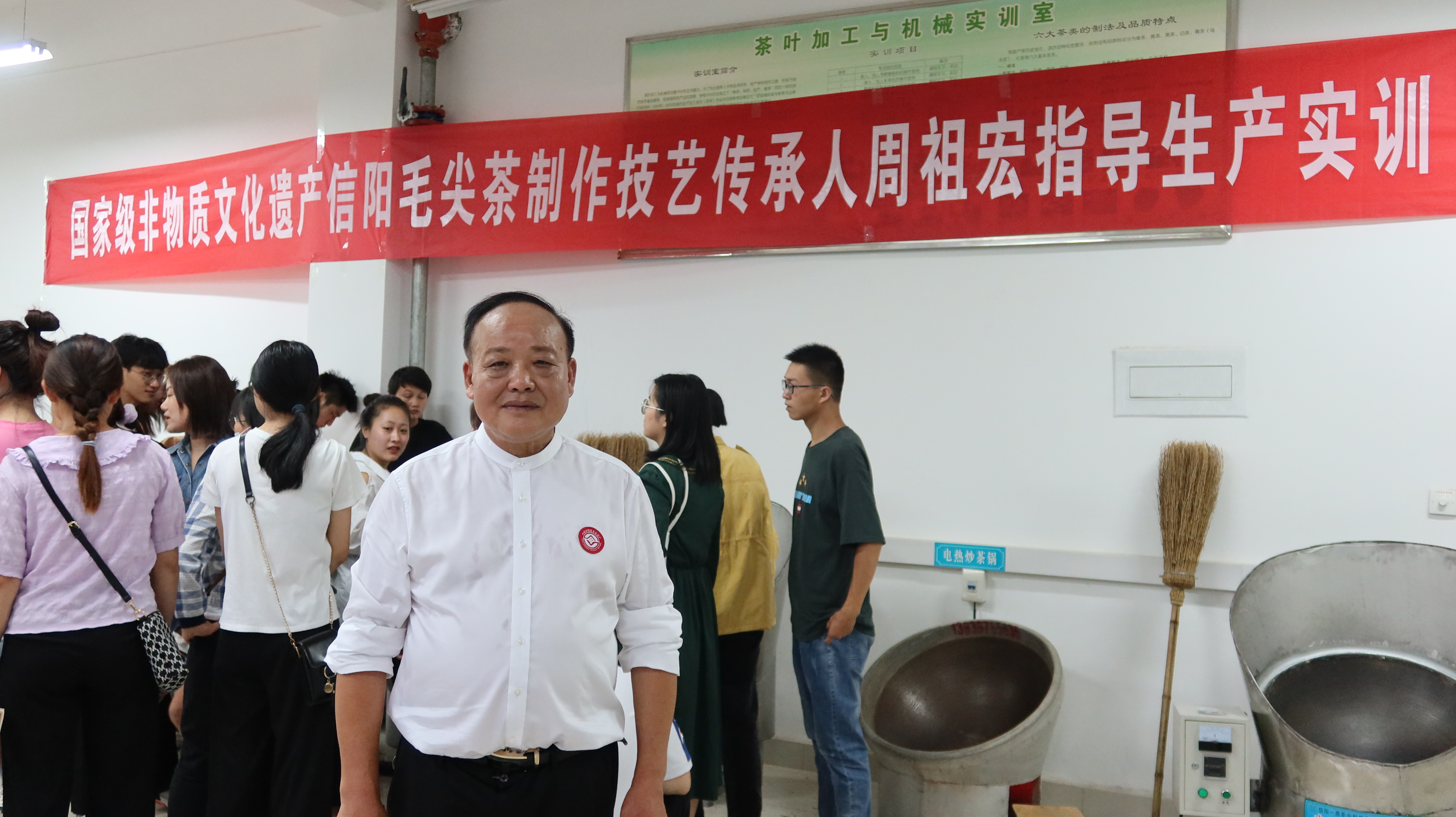 9月10日-9月11日,茶学院邀请国家级非物质文化遗产代表性项目信阳毛尖制作技艺国家级传承人周祖宏先生和信阳市级传承人肖兴亮示范指导学生《制茶学》教学实习—信阳毛尖茶制作。茶学院院长、二级教授、全国技术能手、国家级技能大师工作室领办人郭桂义,《制茶学》专业教师、副院长陈义副教授和王子浩老师等与2位传承人一起共同指导学生传统信阳毛尖手工炒制,黄松副校长、茶学院党总支书记袁丁老师、副院长孙慕芳副教授等进行了观摩督导。