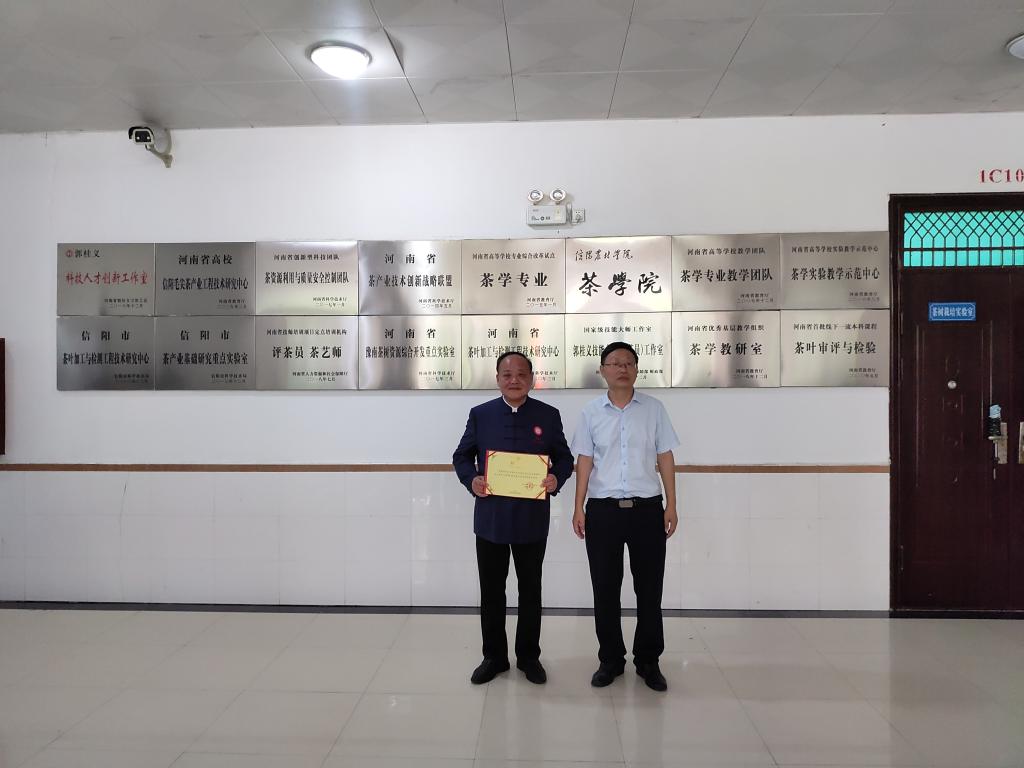 茶学院聘请周祖宏为茶学实践教学指导老师,并颁发了聘书。茶学院高度重视《制茶学》实习,注重“知识传递向能力素质培养”的转变,强化实践教学,培养学生综合能力。通过这次实践教学,使同学们将理论和实践紧密结合起来,把书本和课堂的知识用到生产实践中,进一步了解和掌握信阳毛尖独特的加工工艺。