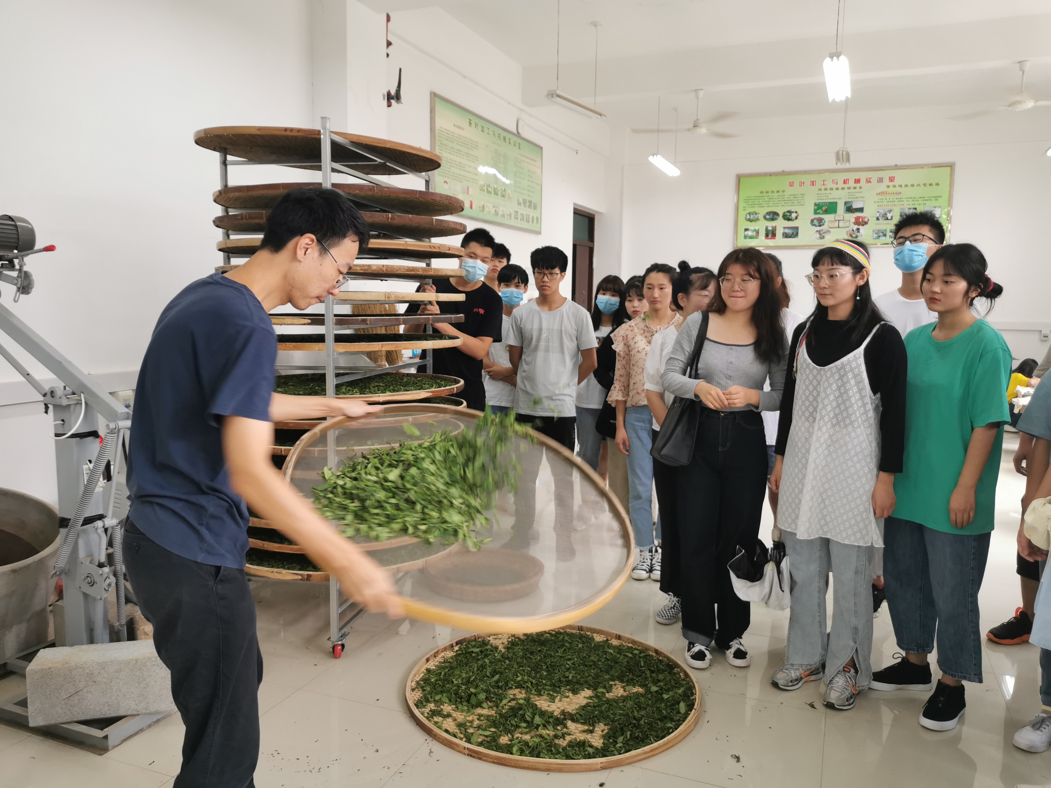 按照人才培养方案要求和《制茶学》课程教学安排,茶学院2017级本科、2018级专科、2019级专升本共计199人于9月7日-9月16日为期8天的《制茶学》教学实习顺利完成。参与本次实习指导的有茶学院院长郭桂义教授,《制茶学》专业教师、陈义副教授、王子浩老师、国家级非物质文化遗产代表性项目信阳毛尖制作技艺国家级传承人周祖宏先生、信阳市级传承人肖兴亮、光山县农村茶叶果树管理站高级茶艺师李家猛以及光山县净居寺茶场高级茶艺师曹璐等现场示范指导学生《制茶学》教学实习。