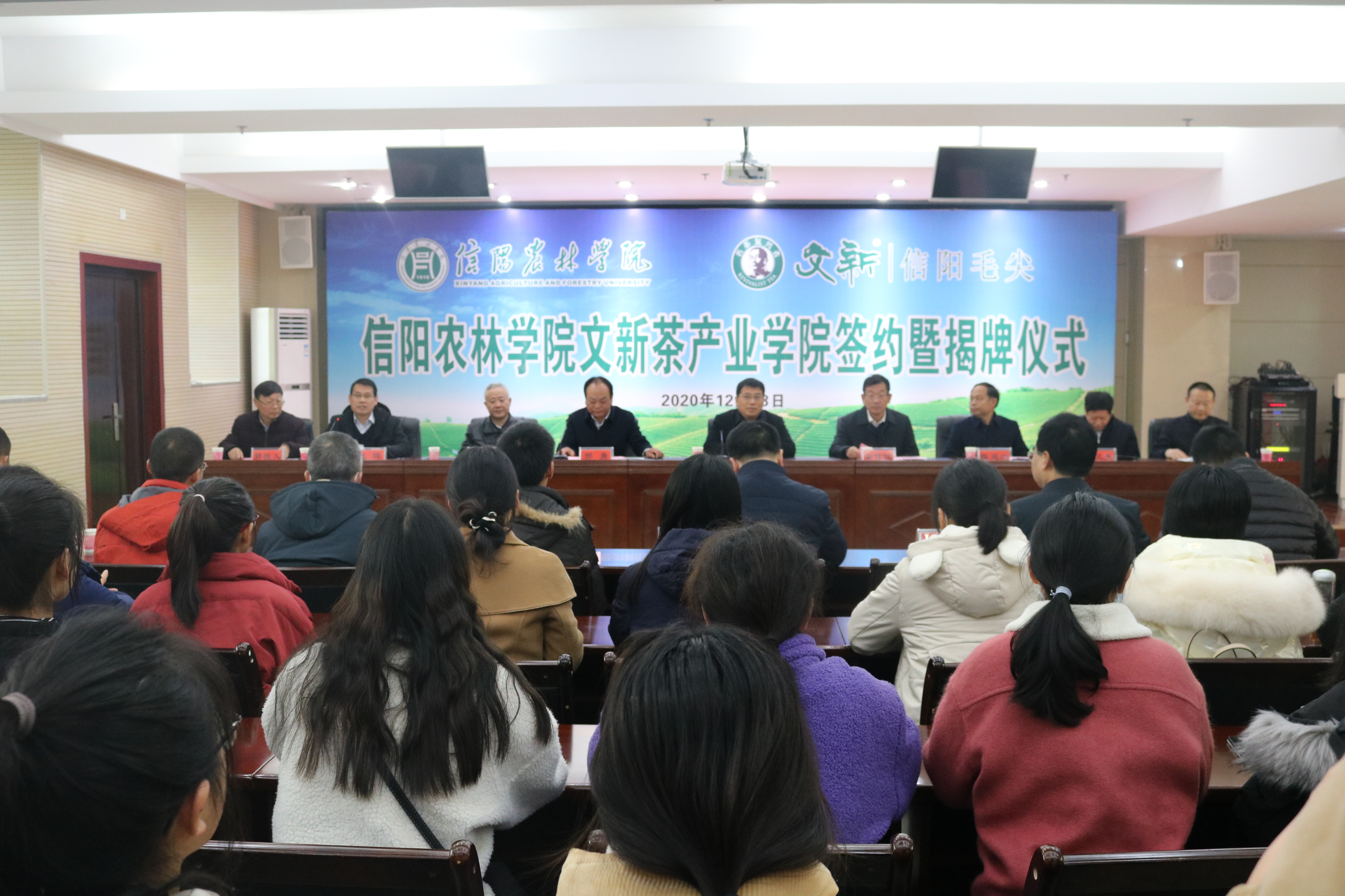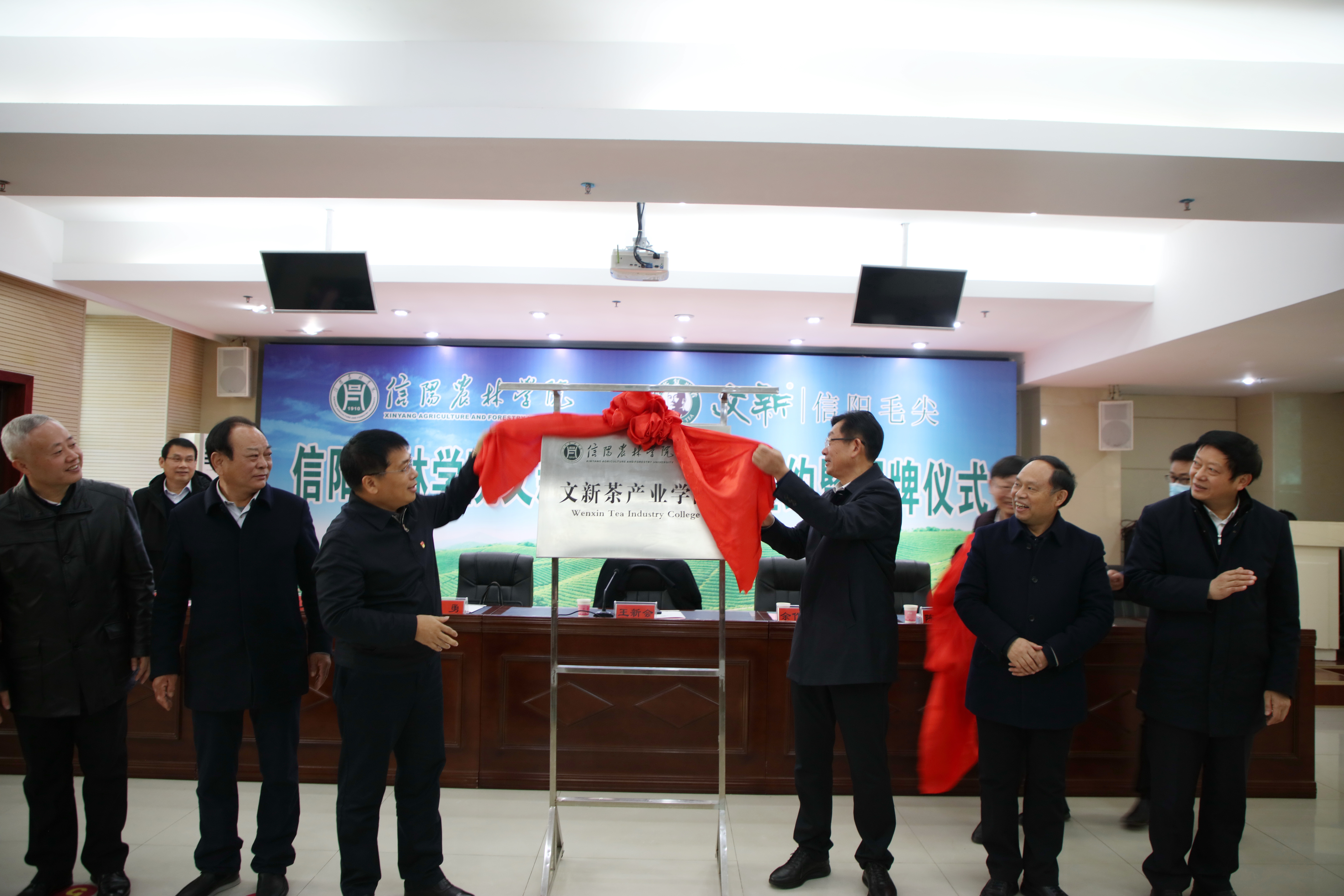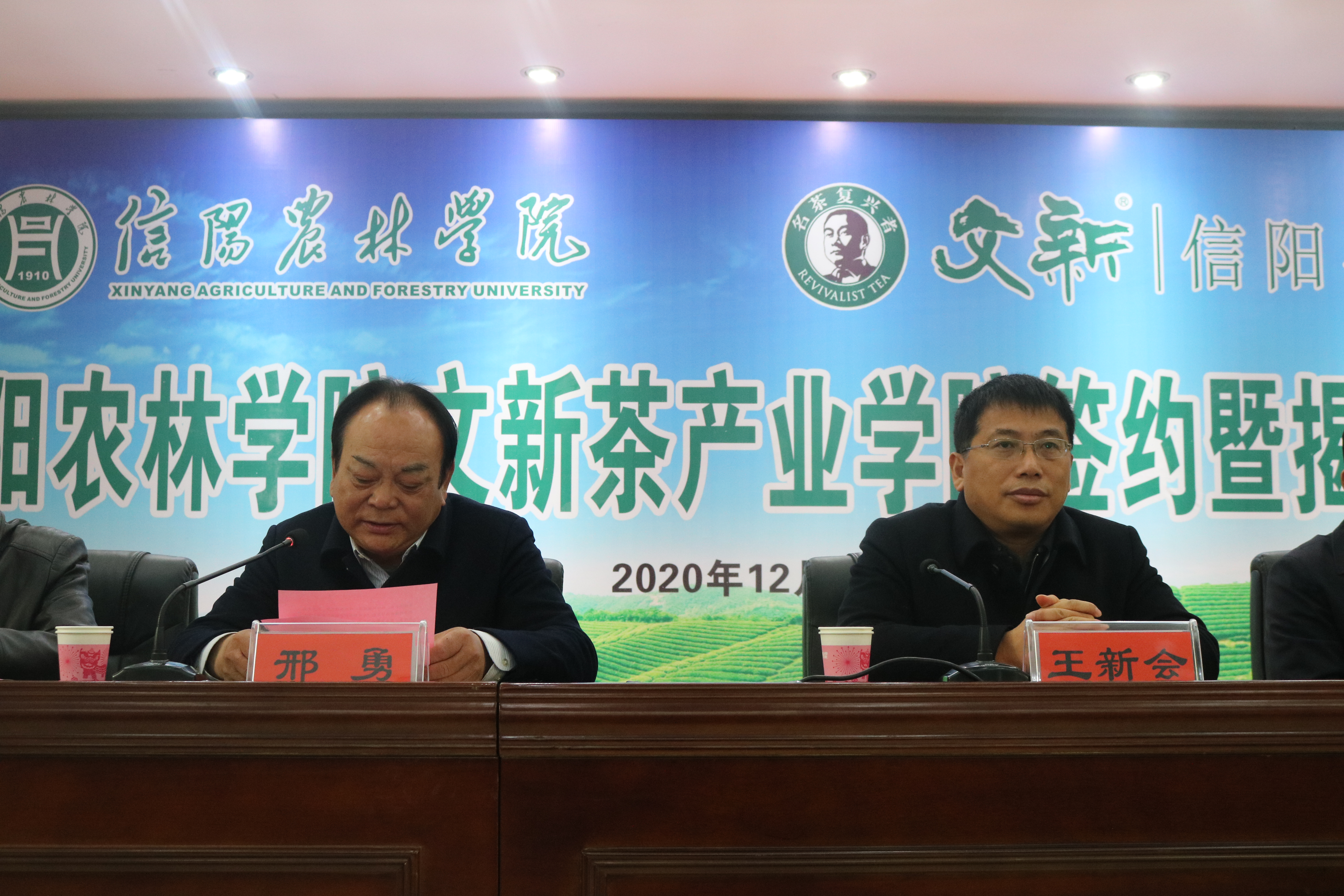 12月23日上午,beat365在线平台官网文新茶产业学院签约暨揭牌仪式在学校综合楼一楼会议室隆重举行。信阳市委副书记、市委统战部部长王新会,信阳市人大常委会副主任陈延虎,信阳市政府副市长胡亚才,信阳市政协副主席吴正先,校党委书记余作斌,校长邢勇,校办主任雷振山、校科学技术(校地合作)处处长史洪中,茶学院院长郭桂义以及信阳市文新茶叶有限责任公司董事长刘文新出席。仪式由副校长赵聘主持,校长办公室、科学技术(校地合作)处、信阳市文新茶叶有限责任公司、茶学院师生代表参加仪式。