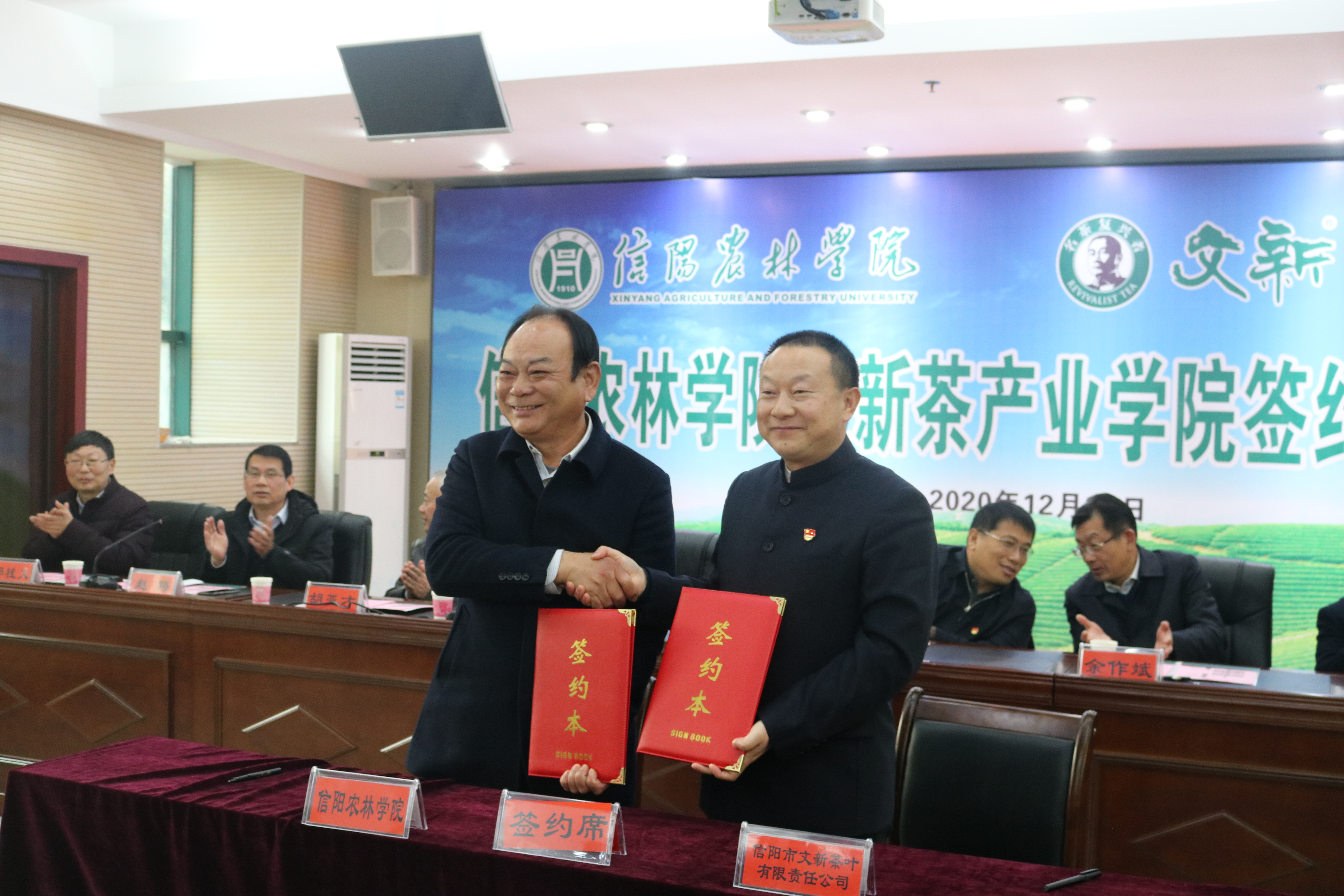 beat365在线平台官网校长邢勇与信阳市文新茶叶有限责任公司董事长刘文新共同在合作协议上签字。