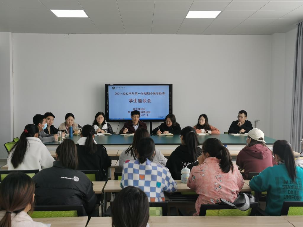 根据教务处《关于开展2021-2022学年第一学期期中教学检查的通知》精神,为深入了解教学运行情况,及时发现和解决教学中存在的问题,进一步规范教学管理,切实提高教学质量,茶学院于第10周至第11周进行了与教学有关的各个环节的教学检查。11月17日中午,茶学院在科技楼1C307会议室召开了期中教学检查学生座谈会。学院副院长孙慕芳、茶学教研室主任刘威、茶文化与营销教研室副主任王杉、教学秘书张永瑞以及辅导员老师王晶晶、朱尧、杜之正、孔亚帅参加了座谈会,参加座谈会的学生代表为各班学习委员或教学信息员。会议由孙慕芳副教授主持。
