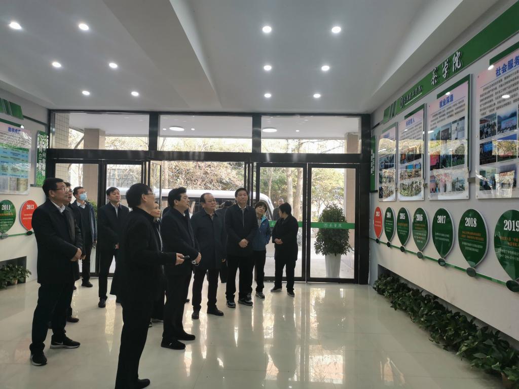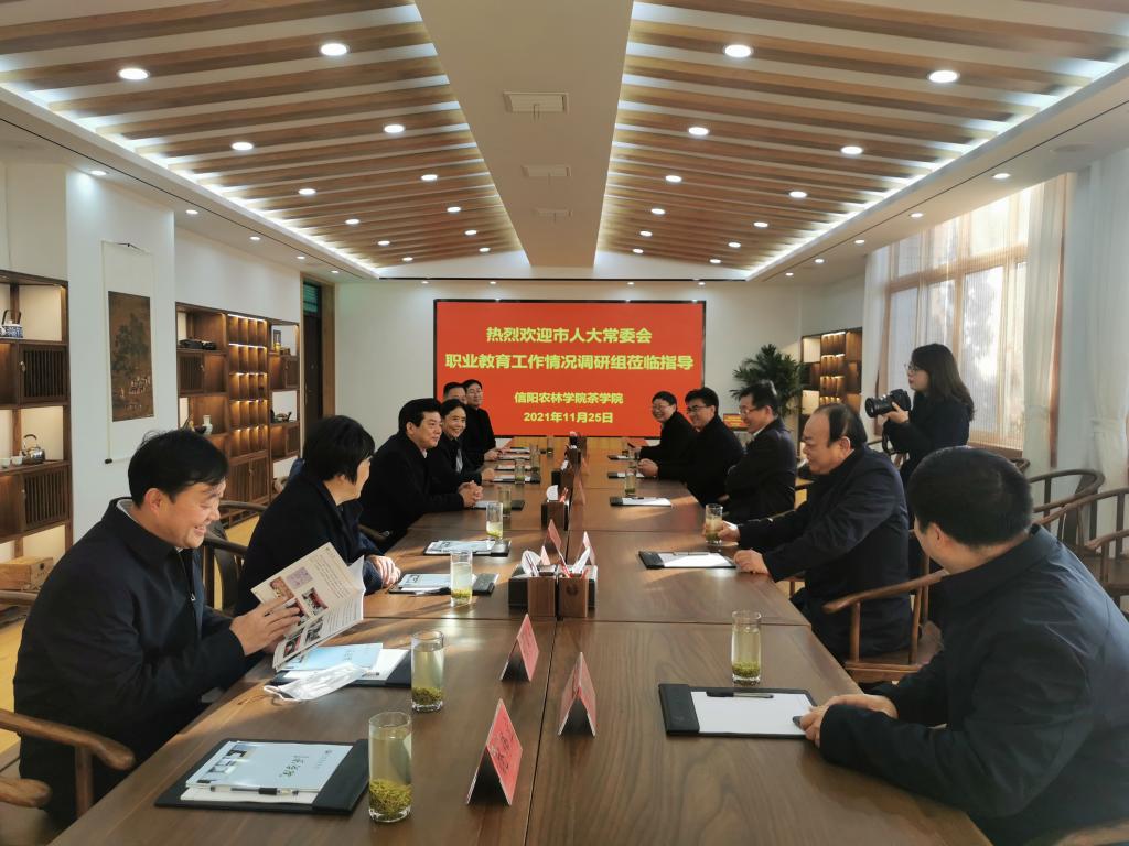 11月25日,信阳市人大常委会主任谢天学、副主任熊静香、市人大常委会社会建设委员会主任委员张善伟、市人大常委会教科文卫委员会主任委员李丽、市人大常委会教科文卫工委副主任(正处级)刘敏、市政协委员、九三学社信阳市委副主委王学增及市政府民生督导组组长程家宝、市教体局副局长高君行、市人社局党组成员、副局长饶伟宏等一行莅临beat365在线平台官网茶学院实地调研职业教育工作。校党委书记余作斌、校长邢勇、副校长赵一鹏、校党委委员、党办主任何涛、校办主任雷振山、茶学院院长郭桂义等参加调研。