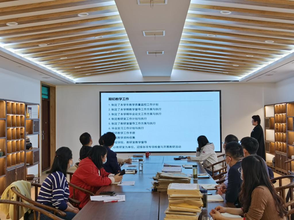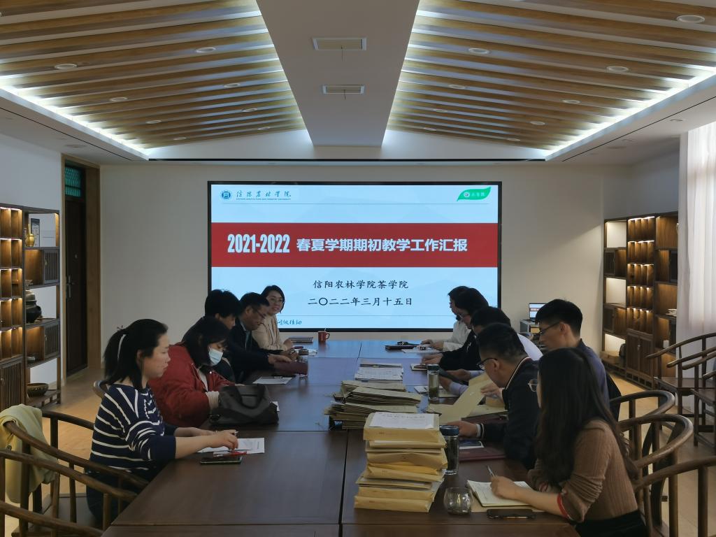 副院长孙慕芳汇报了茶学院教学质量监控工作计划、教学督导工作方案与执行、毕业论文工作方案与实施进度、教研室工作计划与执行、毕业实习情况、教学资料的规范及学院组织学习2022年教育部高教司及省教育厅工作要点、河南省本科高校“课堂教学质量提升年专项行动”实施方案及深化产教融合促进高质量发展行动计划等内容。检查组查阅了毕业实习清单、毕业论文材料的规范性、人才培养方案的执行情况、督导组工作计划与听课记录、教研室工作计划与活动记录、教师工作手册等材料,并给予肯定;郭桂义院长就应用型本科茶学专业虚拟教研室建设与刘开华处长等进行了深入交流。大家对毕业实习、毕业论文等工作中的共性问题进行交流探讨。