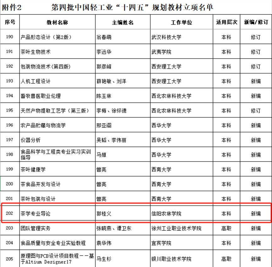 1月3日,中国轻工业联合会发布了《关于公布2024年度中国轻工业教材、数字化、课题等项目评审结果的通知》(中轻联教育〔2025〕1号文件),我院郭桂义教授申报主编的新编教材《茶学专业导论》成功入选第四批中国轻工业“十四五”规划教材立项名单。中国轻工业“十四五”规划教材建设项目的申报及评审工作于2024年6月启动,经中国轻工业联合会组织的专家评审,此次共有237本教材获得立项,其中包括本科教材160本、高职教材70本以及中职教材7本。