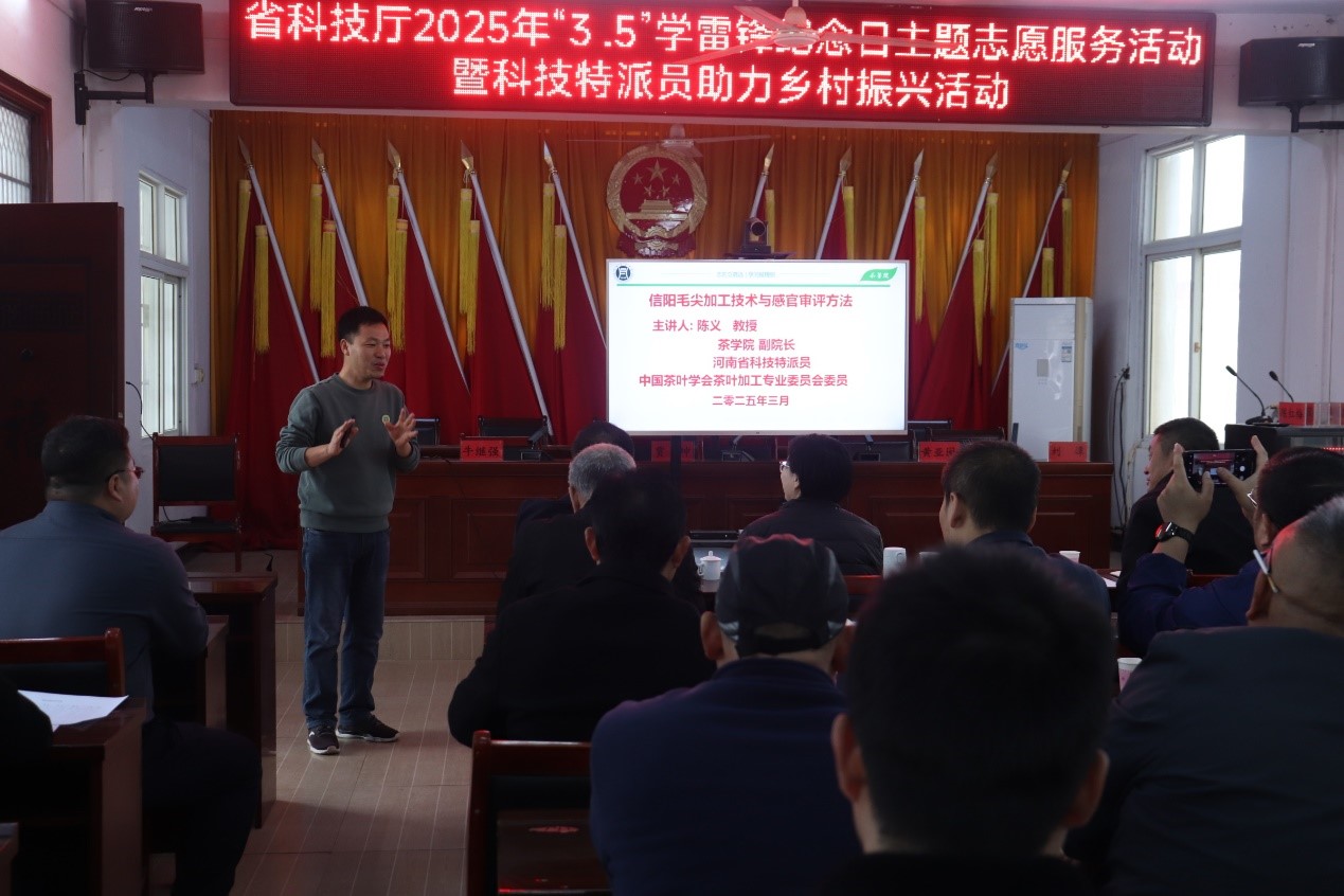 3月28日,河南省科技特派员陈义和河南省茶产业科技特派员服务团成员王晶晶参加光山县“学雷锋 做志愿 科技特派员助力乡村振兴”活动。省科技厅机关党委、农业农村处、省农村中心、信阳师范大学、茶企代表等40余人参加此次活动。