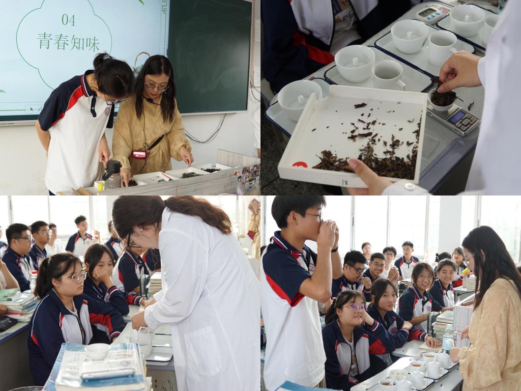活动以“科学识茶,青春知味”为主题,通过茶文化讲解、科学审评和品鉴互动,带领学生们沉浸式体验中华茶文化的魅力。“科学识茶”板块将活动推向高潮。师生们利用专业审评器具,观察茶叶外形、汤色,对比香气与滋味差异。科学审评流程的实操演示,让学生们体会到茶叶审评的严谨性。学生们在对比品尝后踊跃分享感受:“绿茶鲜爽像春天,红茶醇厚如暖阳!”欢声笑语中,茶香与青春气息交融弥漫。