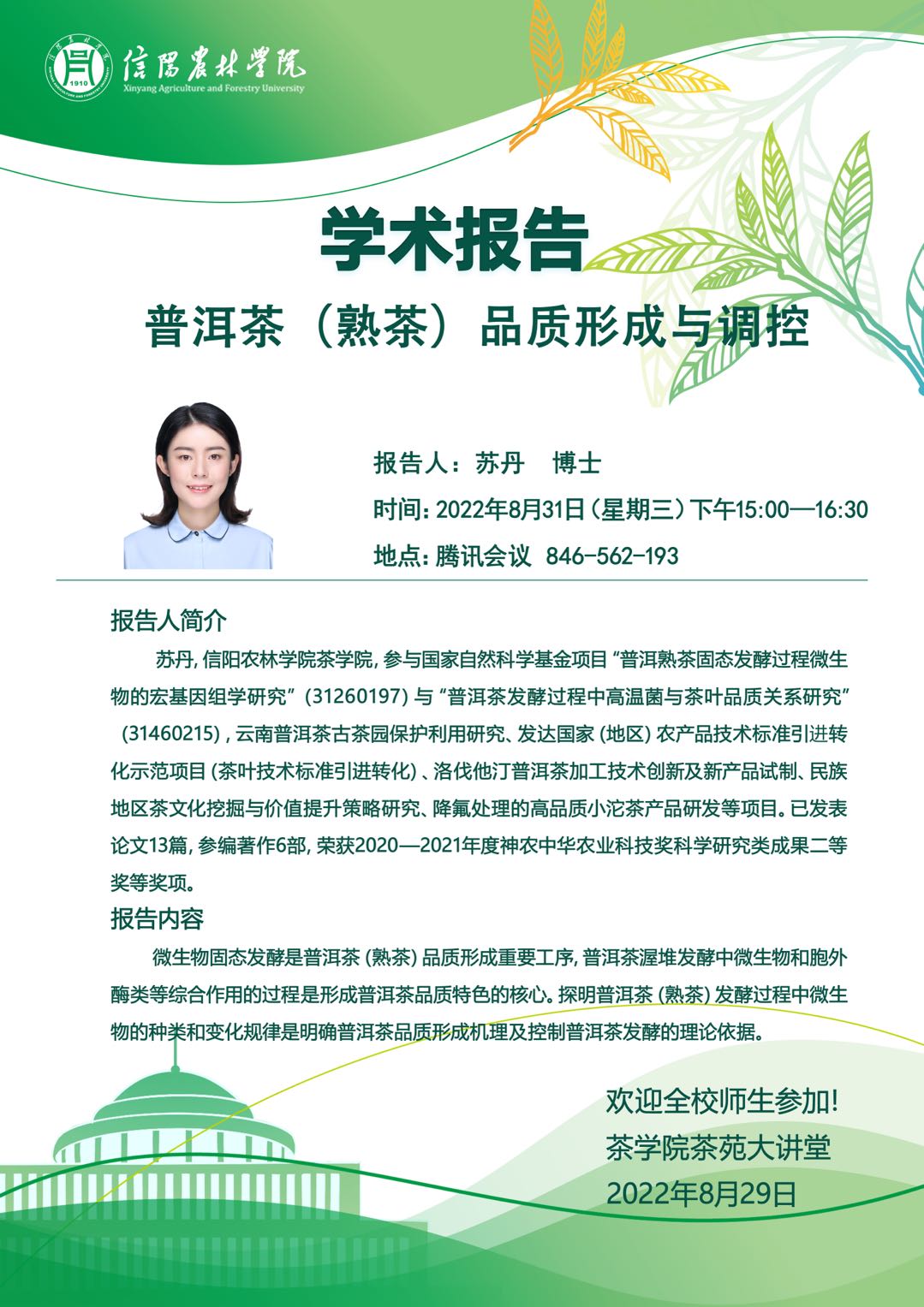 茶学院茶苑大讲堂学术报告海报:普洱茶(熟茶)品质形成与调控