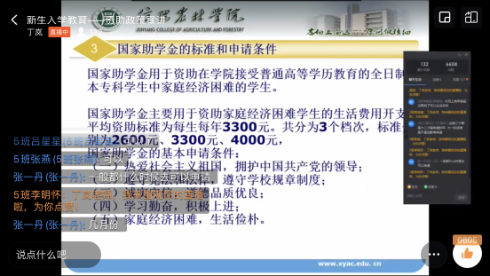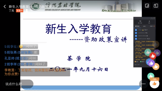为贯彻落实国家高等教育资助政策,帮助新生深入了解大学生资助政策体系,9月16日下午,茶学院资助专员丁岚通过钉钉线上直播,为2021级新生进行入学教育之资助政策宣讲。