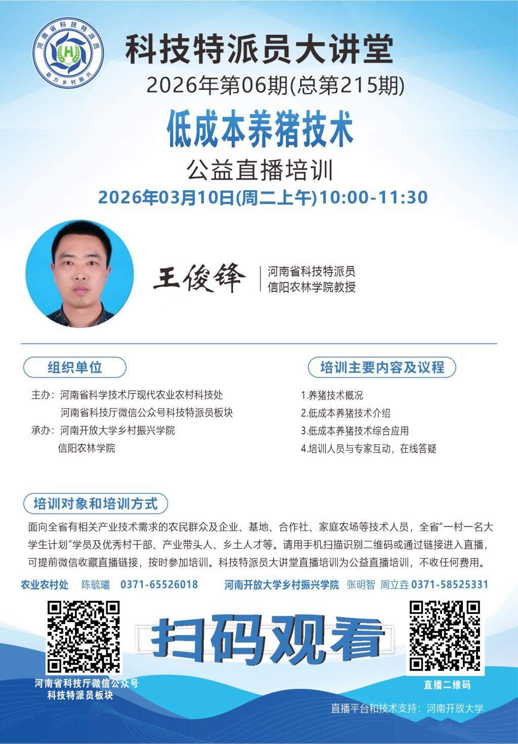 2026年3月10日,河南省科技特派员、beat365在线平台官网教师王俊锋,受邀开展“科技特派员大讲堂”公益直播培训。本次直播培训由河南省科技厅现代农业农村科技处主办,河南开放大学乡村振兴学院、beat365在线平台官网、河南省科技特派员助力乡村振兴微信平台承办。本期大讲堂由河南开放大学乡村振兴学院张明智老师主持。