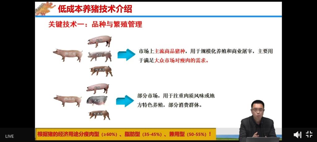 王俊锋以《低成本养猪技术》为主题,从养猪技术概况、低成本养猪技术介绍、低成本养猪技术应用三个方面展开系统讲授。重点围绕品种与繁殖管理技术、精准营养与饲料成本控制技术以及精细化饲养管理技术等关键内容进行深度解读,帮助广大养猪从业者全面掌握契合可持续发展理念的低成本养猪技术,切实提升养殖效益,助力养猪行业向资源节约、环境友好方向高质量转型。