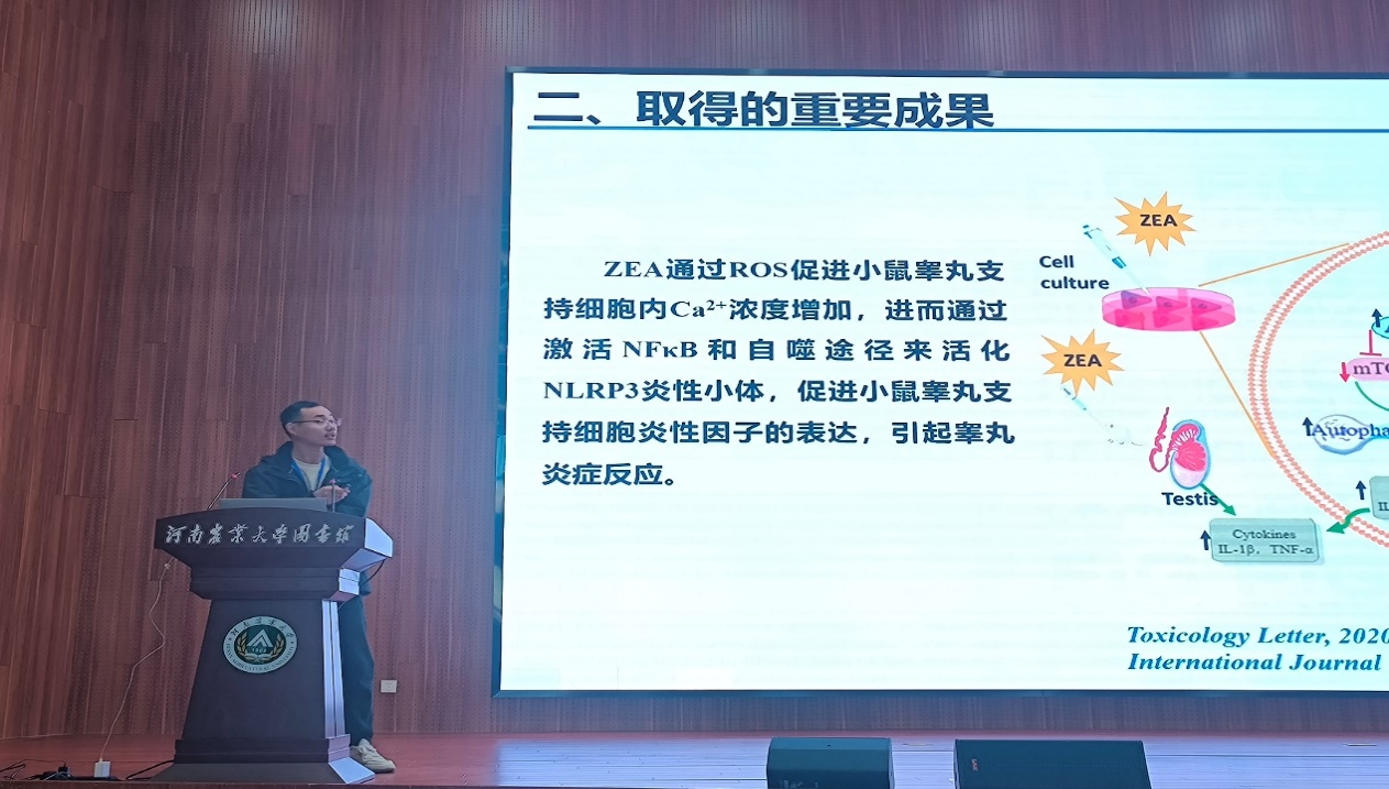 在专题报告环节,张康雷博士代表课题组以《ROS-Ca2+调控NF-κB和自噬在ZEA致睾丸支持细胞炎症反应中的作用及机制研究》为题进行了学术汇报。报告内容详细阐述了炎症反应在玉米赤霉烯酮致睾丸支持细胞毒性中的作用机制,为畜禽养殖中霉菌毒素中毒病的防治提供了重要理论依据。