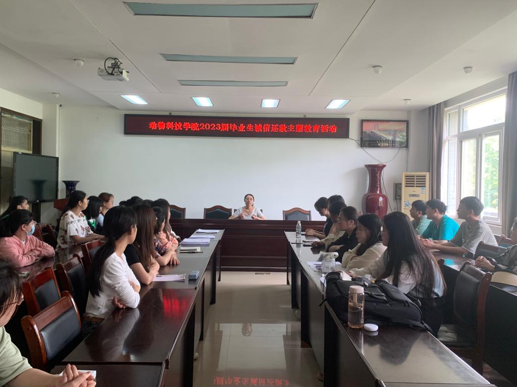 为宣传国家助学贷款政策,加强诚信教育,帮助贷款毕业生了解还款流程、督促学生积极履行还款义务,5月25日中午,动物科技学院于实验楼2C313召开2023届毕业生诚信还款主题教育,学院资助专员陶梦筱老师主持会议,2023届生源地和校园地贷款毕业生参加会议。
