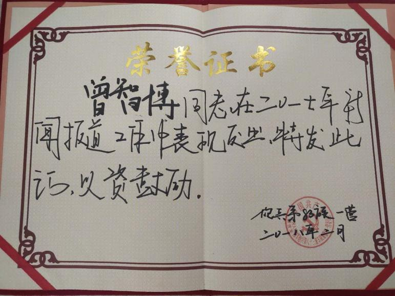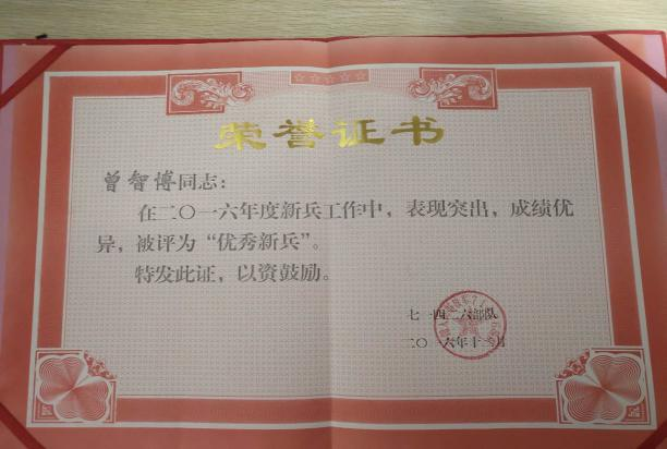 4.2018年9月被评为2018年度“优秀义务兵”且授予勋章,并嘉奖一次。