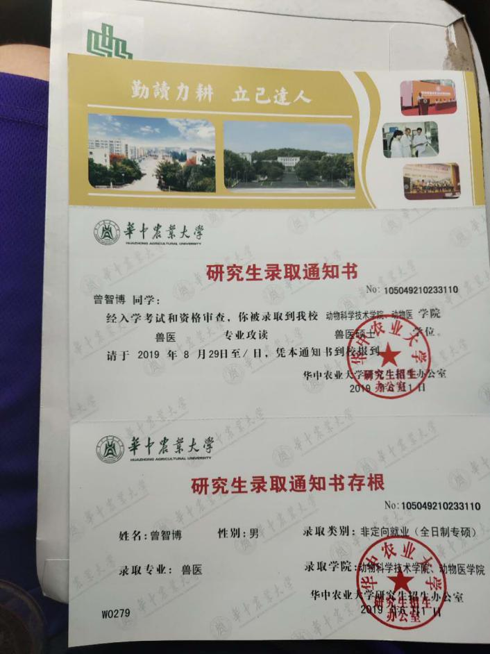2.在2019年6月被华中农业大学录取为非定向全日制兽医专业硕士研究生