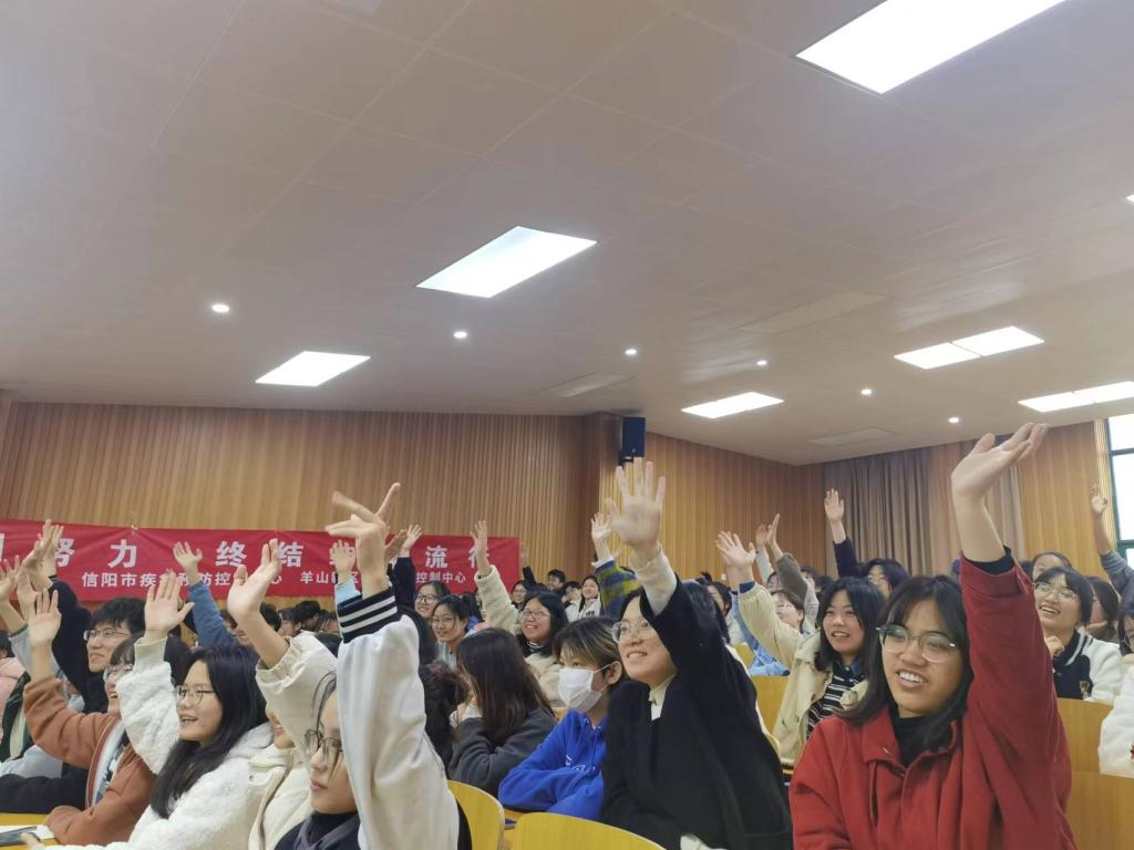 本次讲座我们有幸邀请到信阳市疾病预防控制中心副主任胡艳、结核病预防控制科副科长张雪、艾滋病防治科赵耀。胡艳老师为大家普及了结核病的传播途径,感染方式及如何有效预防结核病。而后由赵耀老师为大家讲解了关于艾滋病的相关知识。在讲座中,胡艳老师和赵耀老师在有奖竞答环节中,有效调动了同学们的主观能动性和积极性,能够更加直接、细致地了解到一些关于结核病和艾滋病的小知识。
