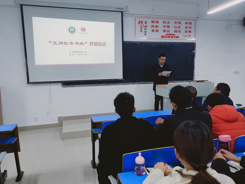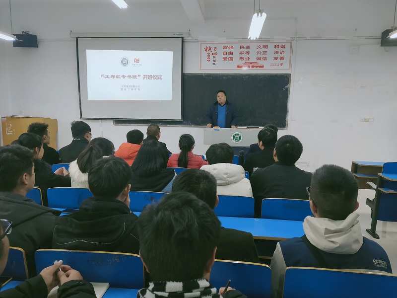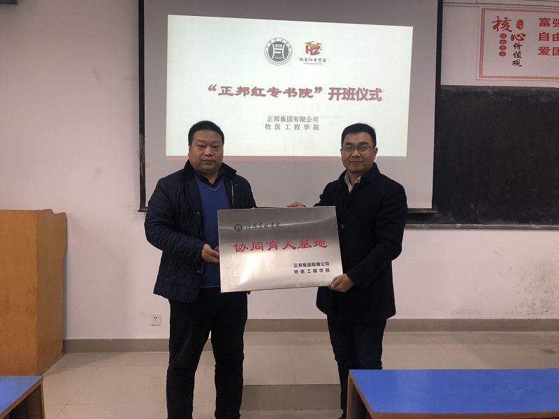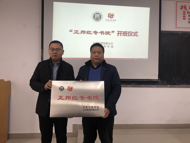 “牧医红专学堂”之后,2019年11月30日,“正邦红专书院” 正式授牌。“正邦红专书院”由江西正邦集团和牧医工程学院联合创建,旨在学生思想政治教育、实习实训、职业生涯规划、就业创业教育、红色基因植入、学生资助等方面,探索新时代校企协同育人新模式。正邦集团徐鹏飞总经理、人资总监王昊苏、牧医工程学院党总支书记刘纪成、副书记张广强,以及首届“正邦红专书院”全体学生和老师代表参会。