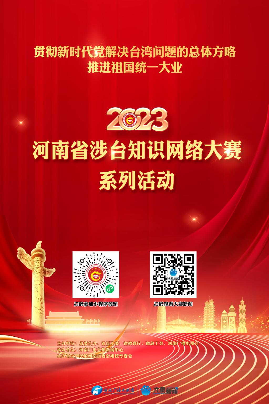 为进一步深入学习宣传贯彻党的二十大精神,扎实做好学习宣传二十大精神和涉台宣传教育工作,由省委台办主办的“贯彻新时代党解决台湾问题的总体方略,推进祖国统一大业”2023年河南省涉台知识网络大赛系列活动将于3月28日至5月6日举办。现将具体情况通知如下: