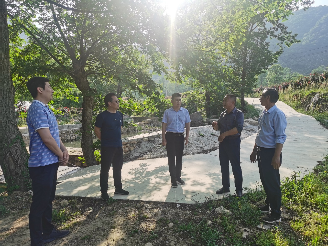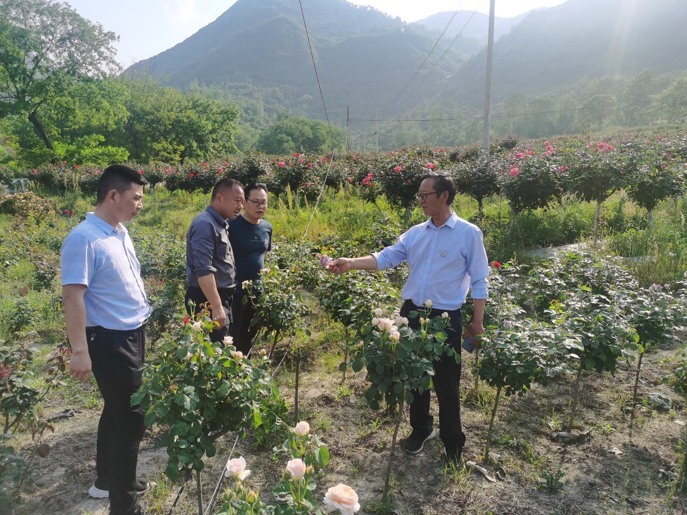 随后,一行人来到月季和桑葚种植区,对防草布使用、月季不同修剪方式对第一茬花的影响、桑葚嫁接后管理方式等情况进行了调研,与企业负责人研讨了花卉最佳管理方式和综合效益,并结合该园区特色和社会需要提出利用花卉资源开发鲜花饼、鲜花精油等产品的建议。