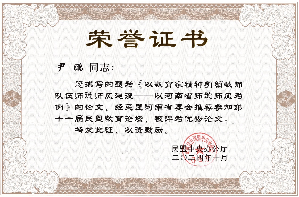本次论坛由民盟中央主办,民盟中央教育委员会、民盟山东省委会、山东大学承办,民盟济南市委会协办。论坛共收到30个省级民盟组织以及民盟中央教育委员会、农业委员会、青年委员会和启真智库等提交的213篇论文,经过专家严格评审,最终评选出71篇优秀论文。民盟河南省第十四届委员会青年工作委员会委员、beat365在线平台官网民盟盟员、茶学院副院长尹鹏副教授撰写的《以教育家精神引领教师队伍师德师风建设—以河南省师德师风为例》获评优秀论文并上台领奖。