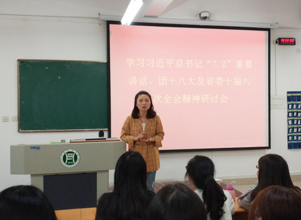 首先,魏薇书记带领团员干部对有关习近平总书记七二讲话精神进行巩固学习,指出作为一名共青团员,要深入学习习近平总书记的精神,热爱党,拥护党的领导,有高尚的理想抱负,有为国为人民服务,为国家强盛而奋斗的豪情壮志,要努力学习,有本领、有技能,才能真正为国家的崛起多做贡献;作为团干部,应多宣传正能量、以身作则,为和谐社会的建设出把力。随后,大家都积极发言,相互交流自己的心得体会,发表自己的看法。在交流活动中,不难体现出同学们对于党和国家的热爱,以及对习近平总书记重要讲话精神的深入领略。