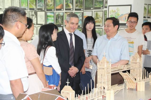 Philip Payne一进展厅,就被丰富的艺术作品所吸引,饶有兴致地观看了学生的作品展示。在鸡公山写生作品展区,他详细了解了学生们对写生作品及创作过程的介绍,并就艺术作品的内涵和表现方式进行了深入交流,并由衷地赞叹:“你们学生的专业基本功很扎实,画的房子非常漂亮,我真想住过去”。随后,Philip Payne来到建筑模型展区,仔细观看了模型设计作品,探讨了中外建筑艺术风格,就其中部分作品的设计理念与学生进行了交流,了解了学生的专业学习情况。参观过程中,学生作品深深吸引了外国友人的注意力,现场气氛十分融洽。