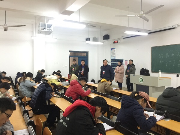 2019年1月15日,规划与设计学院院长胡正元到考试现场开展2018-2019学年秋冬学期期末考试巡考工作,陪同巡考的有学院教学督导组成员李益南、黄泽平、梁涛老师。