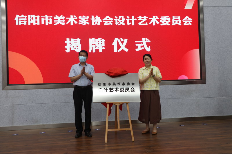 成立大会上,赵聘和殷丽共同为信阳市美术家协会设计艺术委员会揭牌。