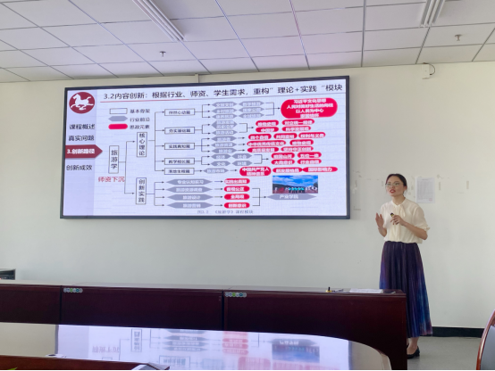 史亚奇副教授基于自身课程建设的实践探索,从课程建设的意义、建设课程的选取、课程建设的过程和课程建设的落脚点四个方面,系统阐述了课程建设各环节的注意事项和课程打造方法。她强调,课程建设要以专业核心课程为起点,针对不同的课程建设类型,做好分类建设并以清晰的课程建设目标为抓手,关注教学大纲、教学设计、教学课件、教学资源库、评价体系、说课视频六个课程建设基本要素,做到学做思并行,以学校定位为基础,以生源特色为对象,以教师活动为主导,以学生学习为成效,打造出适应新时代人才培养需求的课程。随后,史亚奇副教授以获得河南省本科高校研究性示范课、河南省本科高校课程思政样板课、课程思政教学团队的《旅游学》课程为范例,进行了《文旅萌芽落地生根——基于“师生共建,思创融合,时空互动,拥抱未来”的< 旅游学>教学创新》的教学展示。