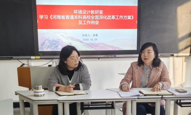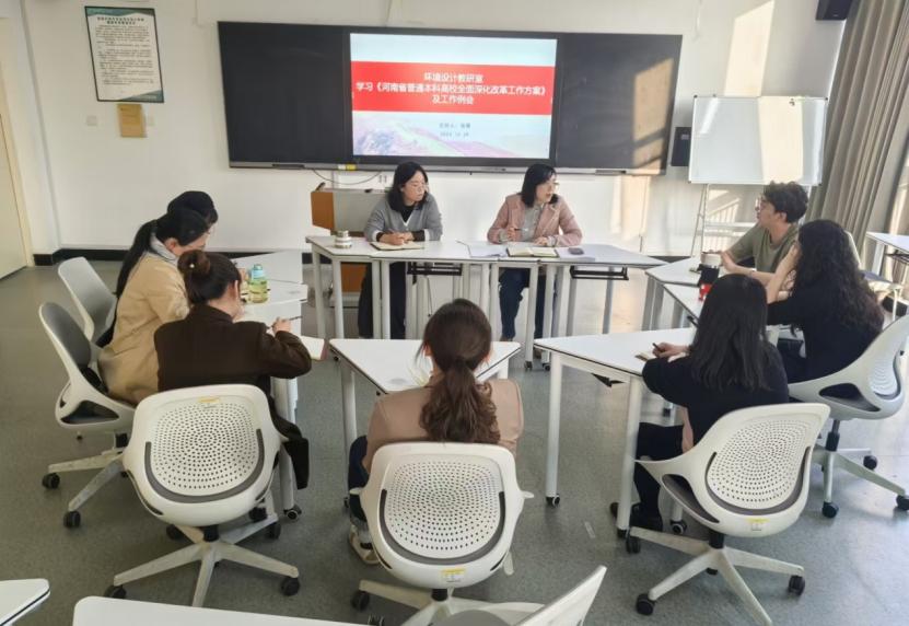 首先,由环境设计教研室主任徐曼带领学习了《河南省普通本科高校全面深化改革工作方案》、《beat365在线平台官网关于制定2025版本科人才培养方案的指导意见(征求意见稿)》文件,就运用人工智能助力教育教学、强化实践教学、优化课程设置为核心,重点对2025版的人才培养方案的制定中的专业理念和组织架构进行了解读。