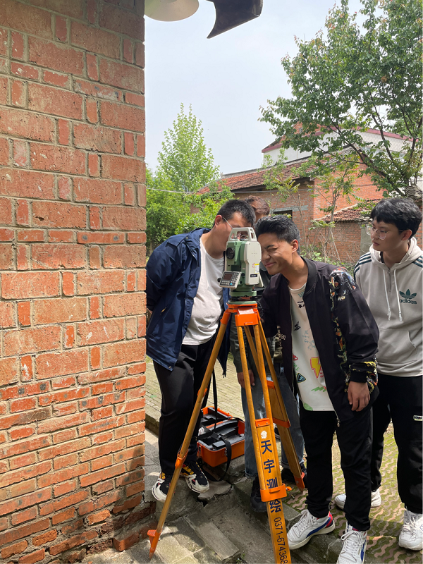 本次调研分两部分进行。农房设计项目组成员在与老师沟通后,选定有代表性的农房民居进行考察,同时由孙老师全程指导,使用全站仪等相关器材测量目标建筑收集全面数据,对于房屋空间体量、功能布局进行分解考察。接着,张老师带领同学们沿着新集村南北轴线考察当地建筑风貌,对比了当地建筑改造前后的情况,一起分析建筑的改造设计手法,归纳总结了当地民居的整体风貌特征和需要保留的设计元素。随后,同学们深入村落各个单体建筑,感受空间布局,观察建筑形态,思考在此整体风貌环境下如何进行游客服务中心课程设计。
