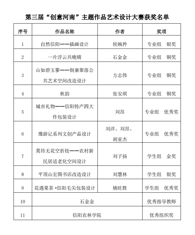 近日,河南省第三届“创意河南”主题作品艺术设计大赛获奖名单揭晓。本次大赛共有42个高等院校参加,我院师生经过层层角逐,在大赛中荣获专业组银奖1项、铜奖3项、优秀奖2项;学生组金奖1项、银奖1项、优秀奖1项;石金金获优秀指导教师奖;beat365在线平台官网获优秀组织奖。