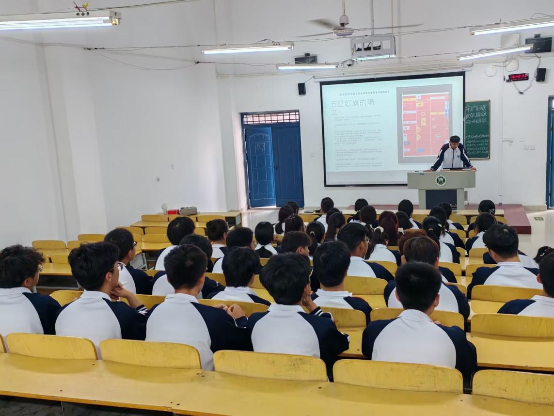本次活动以维护国旗、国歌、国徽的法律地位和尊严为主线,通过多个环节的安排,使同学们深入了解国旗、国歌、国徽的重要性。活动中,各班团支书带领同学们进行了团员宣誓、齐唱国歌和团歌活动,并通过PPT和视频资料向同学们讲解国旗、国徽图案的构成和意义,介绍国旗的升降要求和使用场合,奏唱国歌的场合、礼仪,讲述篡改、贬损国旗、国歌、国徽将要承担的法律后果。告诫学生维护国歌、国旗、国徽的尊严是每个公民的义务和责任,引导广大学生要做国旗的“守护者”、国歌的“唱响者”、国徽的“致敬者”。期间,还邀请学生代表上台分享了当代青年对如何守护国旗,如何致敬国徽,如何唱响国歌的感受以及做法。