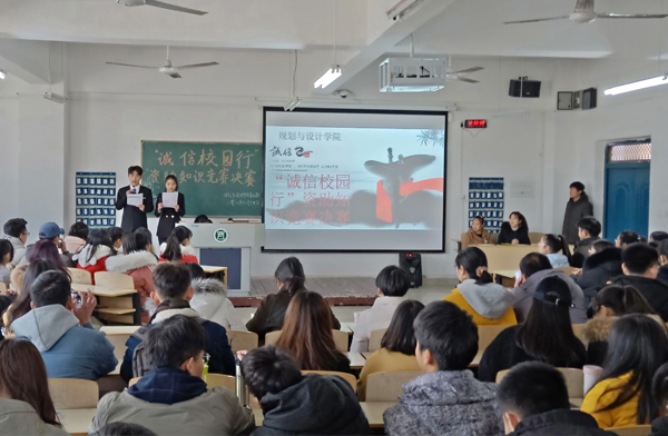 为宣传学生资助政策、普及金融基础知识,培养大学生的诚信意识和观念,进一步促进诚信校园建设等相关内容,同时为防止不良“校园网贷”等金融诈骗现象的发生,12月14日中午,规划与设计学院在二教201举办了“诚信校园行”资助知识竞赛。规划与设计学院资助专员余丰老师,2018级新生辅导员老师以及2017、2018级学生参加了此次活动。