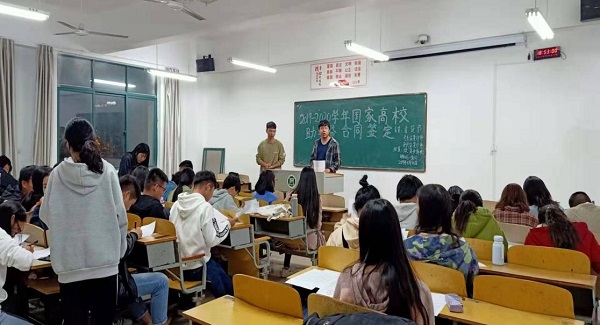 为做好学院2019学年国家高校贷款工作,11月4日晚上,规划与设计学院2019-2020学年国家高校贷款合同签订仪式在二教216B进行。会议由学院资助专员余丰老师主持。