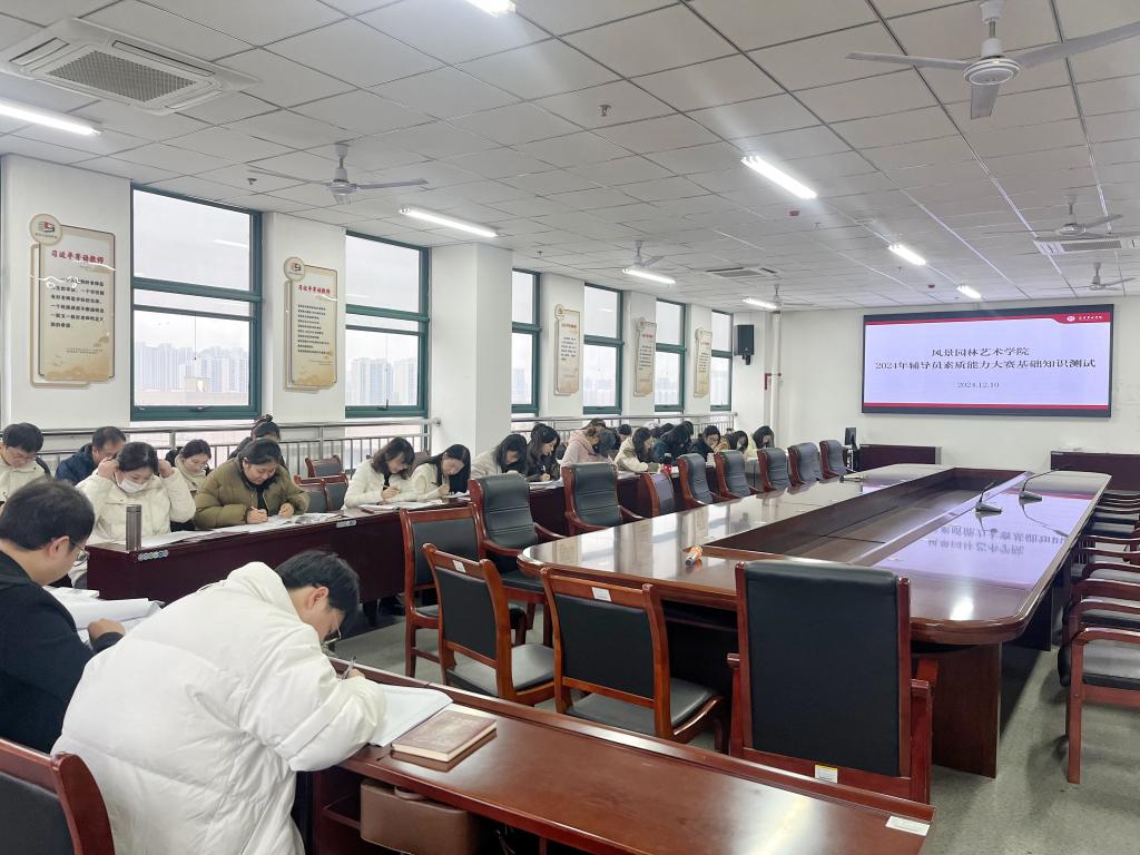 全面提升辅导员队伍的专业素养和综合能力,进一步推动学生思想政治工作的开展,助力培养德智体美劳全面发展的社会主义建设者和接班人。风景园林艺术学院于2024年12月10日、17日在文学艺术楼会议室开展了2024年度辅导员素质能力大赛初赛的基础知识测试环节和理论宣讲环节,我院全体专兼职辅导员参加了本次比赛。