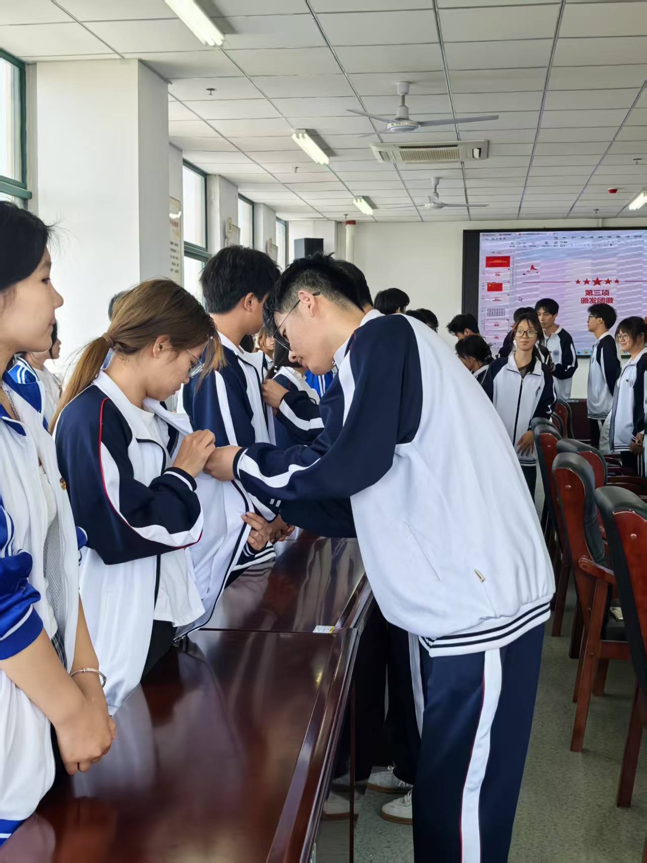 新团员入团仪式在庄严的国歌声中拉开帷幕。全体起立,奏唱国歌,现场气氛庄严肃穆。紧接着,辛颖老师宣读了新团员名单,34名同学光荣加入中国共产主义青年团。随后,老团员代表为新团员郑重佩戴团徽,一枚枚团徽在胸前闪耀,承载着共青团的光荣与使命。在领誓人朱若楠的带领下,全体新团员面向团旗,右手握拳,以洪亮坚定的声音庄严宣誓,表达了新团员们对共青团组织的无限向往和为团组织增光添彩的坚定决心辛颖老师宣读《团章》中有关团员义务和权利的条款,新团员和老团员代表分别进行了发言,表达自己积极进取,充分发挥模范带头作用,努力做有理想、敢担当、能吃苦、肯奋斗的时代先锋。